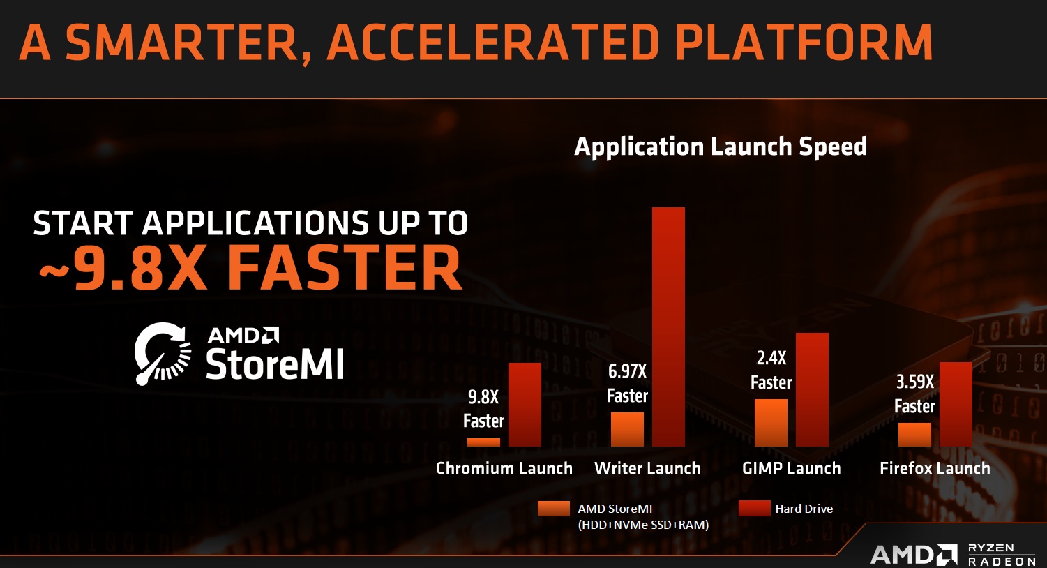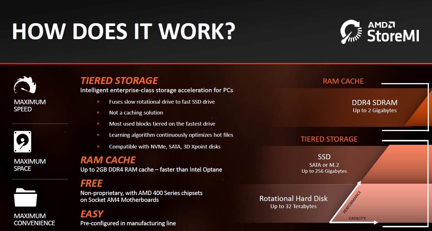 En la imagen que acompañamos podemos ver las características más importantes de este nuevo chipset. Con él podremos hacer overclock a cualquier procesador Ryzen compatible y también a la memoria RAM, disfrutaremos de tecnologías como XFR 2 y Precision Boost Overdrive, que eleva las frecuencias de trabajo del procesador de forma automática para mejorar el rendimiento en situaciones concretas, y StoreMI, la particular respuesta de AMD a Optane de Intel que combina un HDD, un SSD y hasta 2 GB de memoria RAM DDR4 a modo de caché trabajando de forma conjunta para acelerar el rendimiento del sistema. La tecnología StoreMI no requiere de ningún tipo de componente específico.