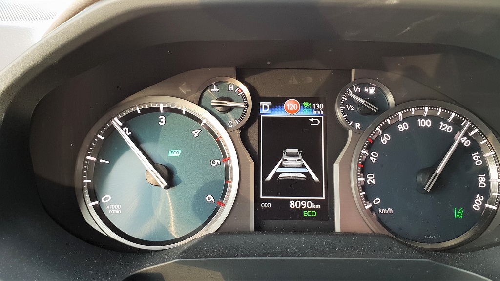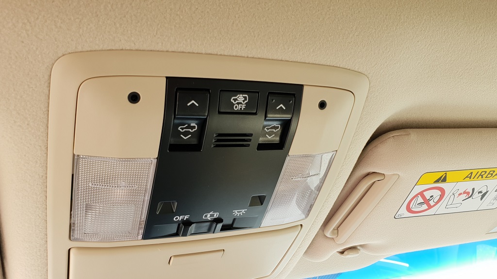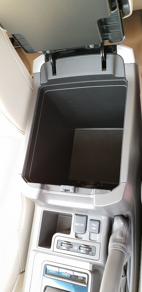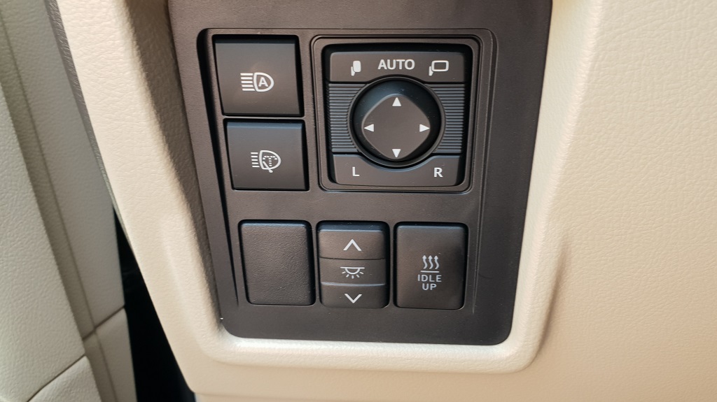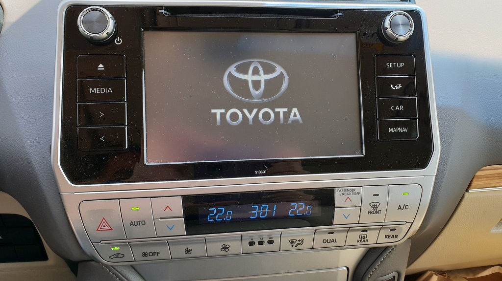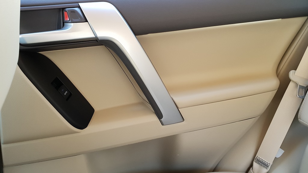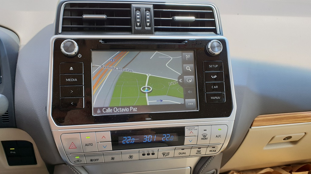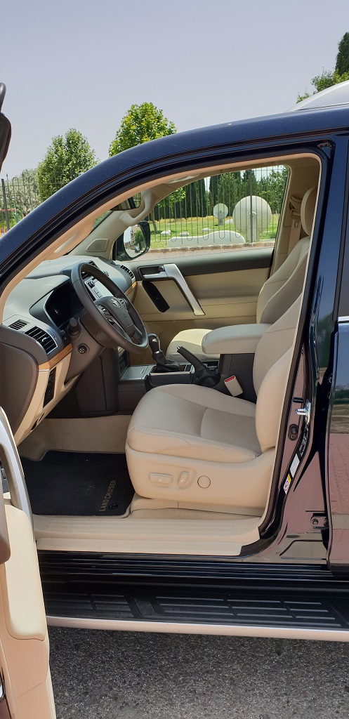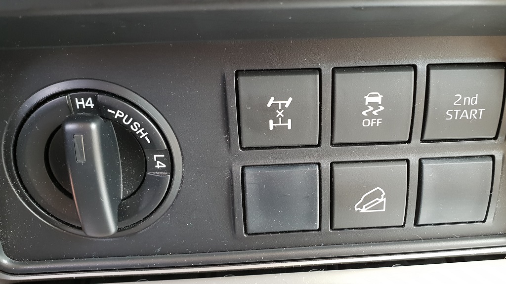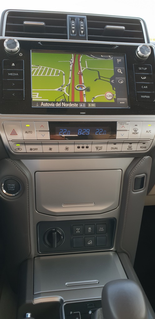 Al entrar en el coche también podemos ver enseguida su vocación para navegar más fuera del asfalto que dentro. Lo primero los asideros de agarre que no faltan ni siquiera sobre la puerta del conductor, signo inequívoco que el gran Toyota está preparado para bailes movidos. En el salpicadero la consola central en la parte más baja vemos varios botones con distintas funciones todoterreno como el modo para descensos pronunciados pero sobre todo la posibilidad de bloqueo de diferencial y la de engranar la reductora para afrontar tramos complicados fuera de las pistas con selector H4 – L4 (marchas bajas o Low y marchas altas o High).