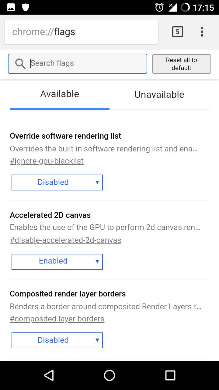 Chrome para Android se nutre en buena medida de la base tecnológica de Chromium, por lo que hereda muchas de las características de este. Por ejemplo, el usuario puede introducir la URL “chrome://gpu” y ver las partes de la web que están siendo aceleradas por hardware, software o no lo están, además de “chrome://flag” para poder modificar el comportamiento de la aplicación desde muchos frentes (ya que estamos, se puede probar a forzar la aceleración para ver si se obtienen mejoras).