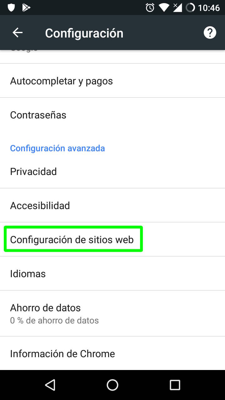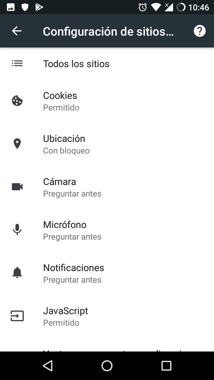 Los permisos en Chrome para Android se gestionan desde dos frentes. Uno son los apartados a los que tienen acceso o pueden desplegar los sitios web, siendo estos catorce en total: