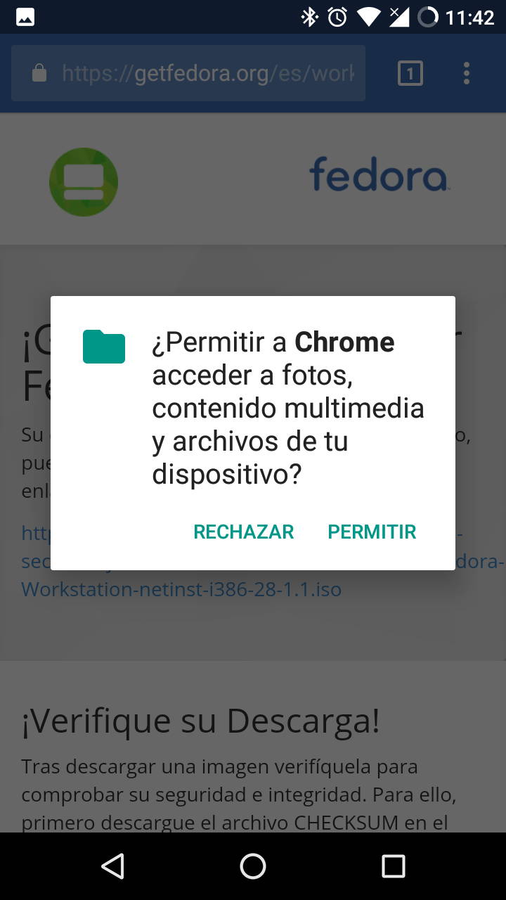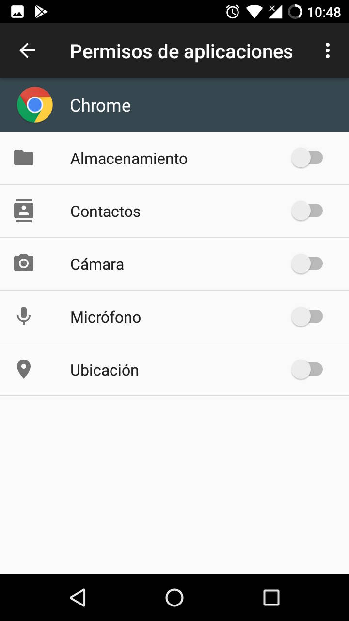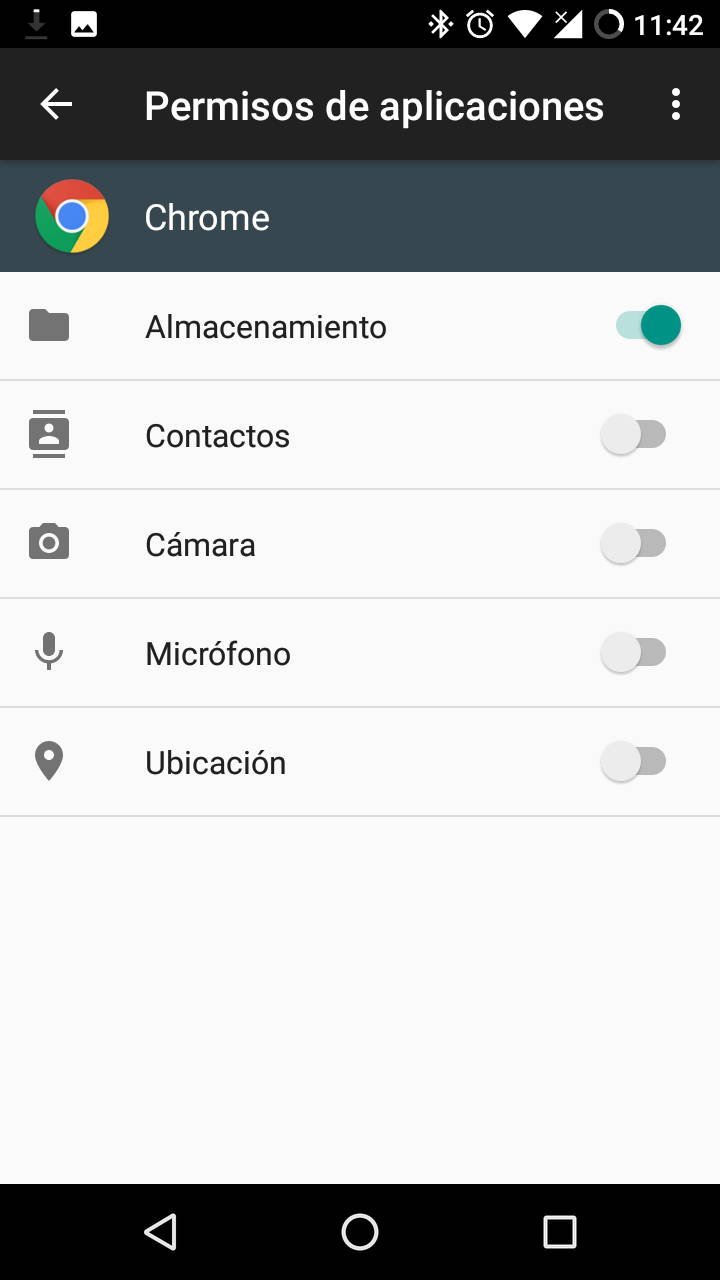 Lo segundo es vigilar lo concedido a la aplicación a nivel del sistema, cosa que se puede comprobar desde Ajustes (en Android, no en Chrome) > Aplicaciones > Chrome > Permisos. Es importante tener en cuenta que conforme se va usando la aplicación esta podría solicitar permisos a nivel del sistema, como por ejemplo acceder al almacenamiento para la descarga de archivos.