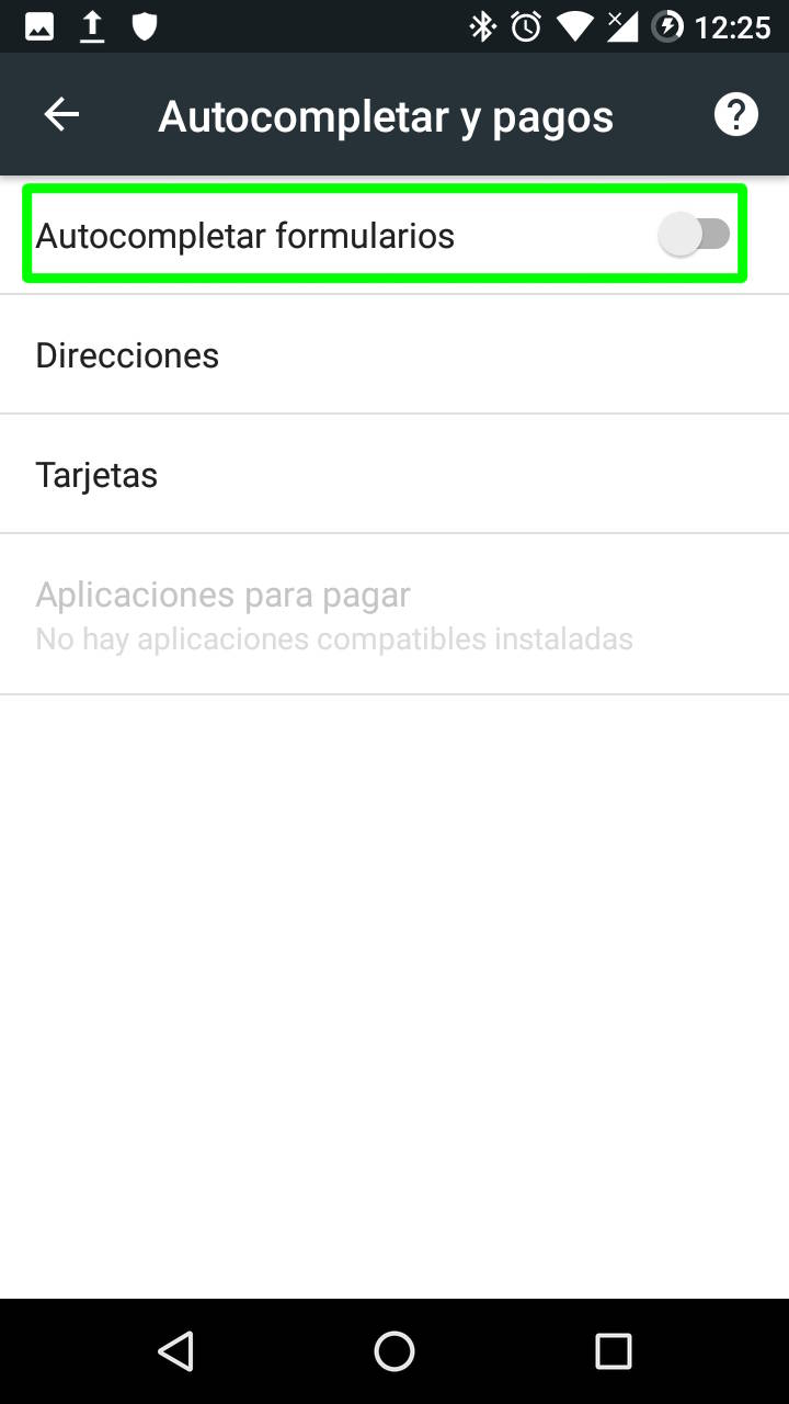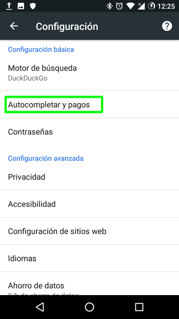 Inhabilitar el autocompletado es una práctica muy recomendable para evitar problemas a nivel de privacidad que pueden derivar en situaciones más graves como el robo de dinero tras la sustracción de los datos de la tarjeta de crédito. Para hacer esto en Chrome para Android el usuario tiene que dirigirse a “Autcompletar y pagos” en la configuración de la aplicación.