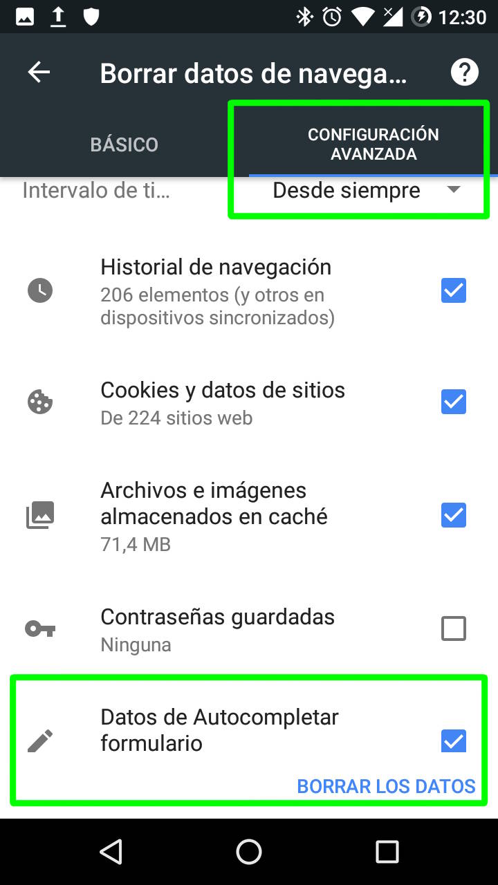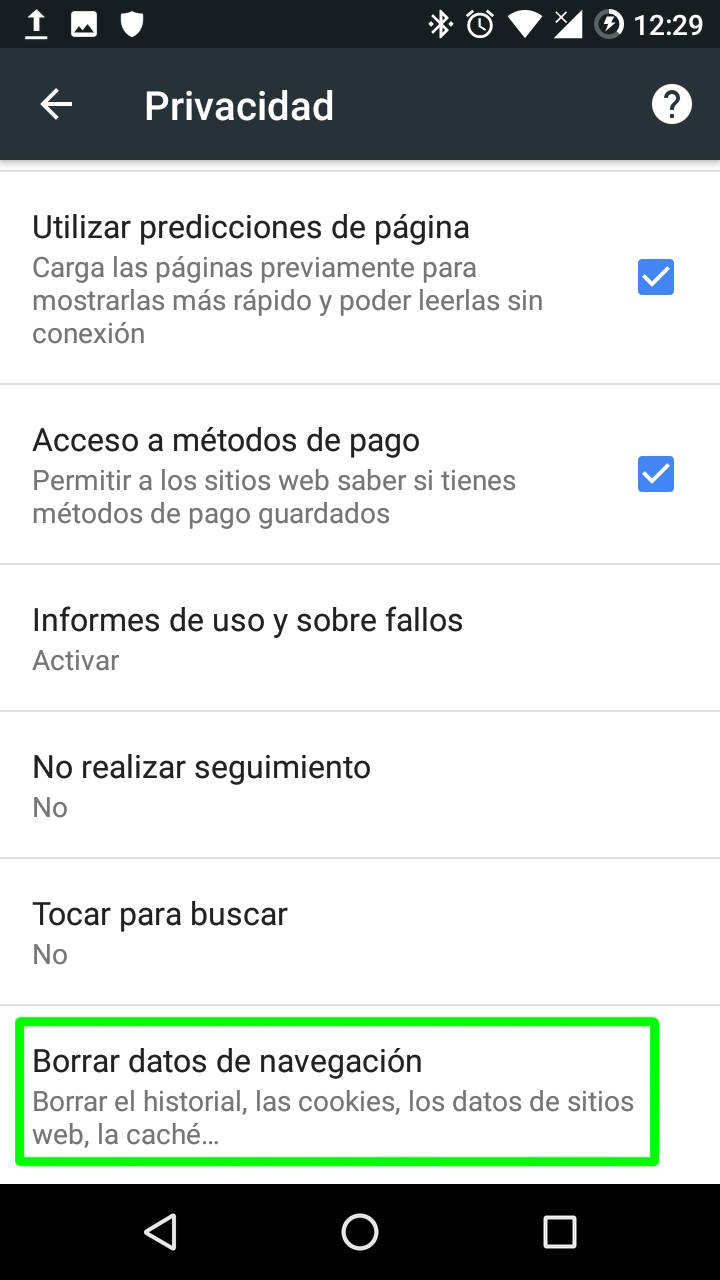 Además de esto, si se ha estado usando Chrome durante un tiempo, sería conveniente borrar lo guardado y acumulado por la aplicación yendo a Configuración > Privacidad (Configuración avanzada) > Borrar datos de navegación.