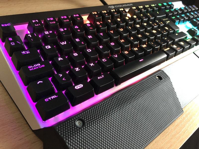 Pasamos ahora a centrarnos en el teclado. El Cougar Attack X3 RGB es un modelo muy sólido y con un diseño bien planteado, siendo su único punto flaco el reposamuñecas. Ya lo hemos comentado en dos ocasiones, así que no vamos a volver a ahondar en ello: cumple, pero no “pega”.