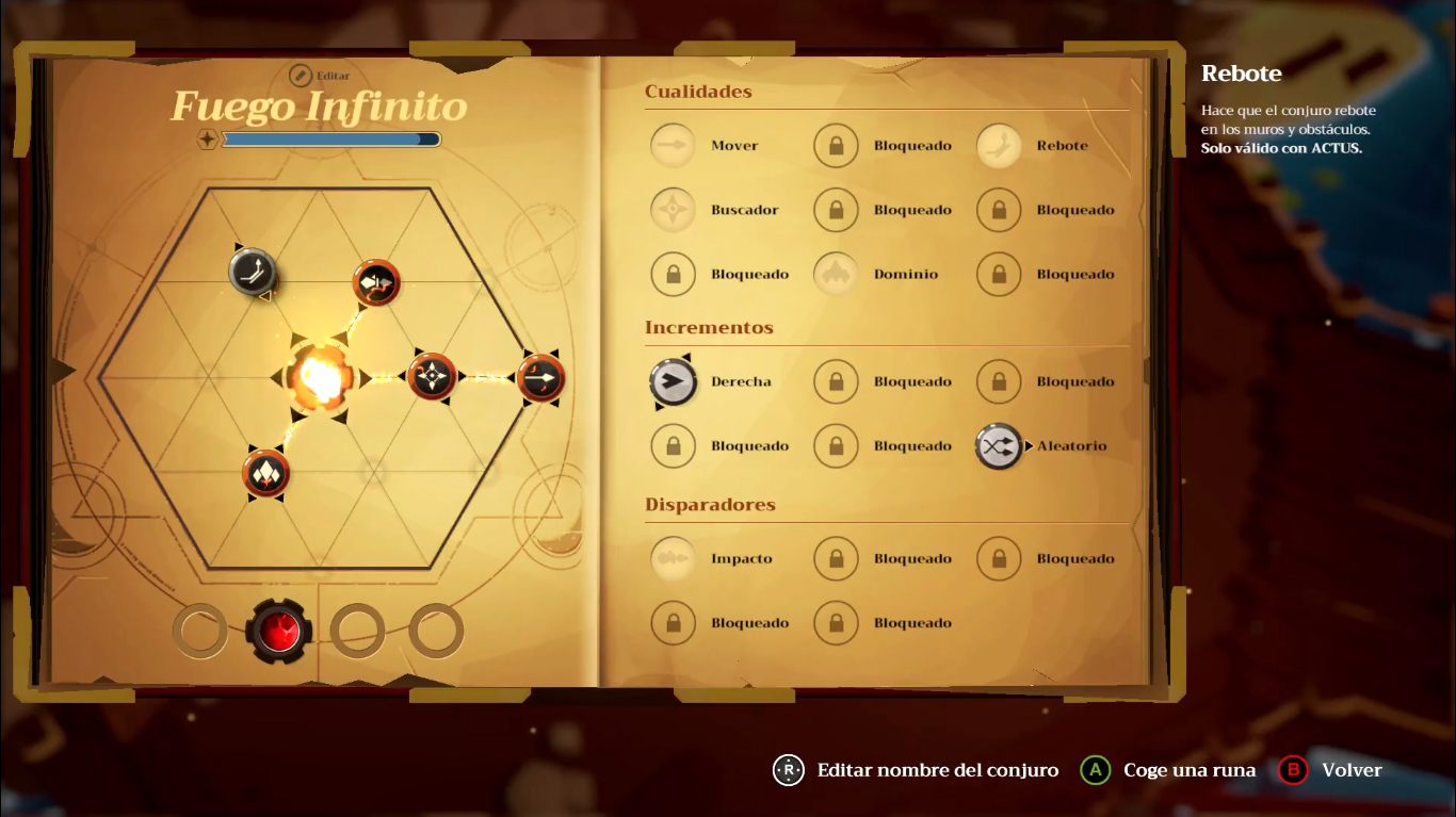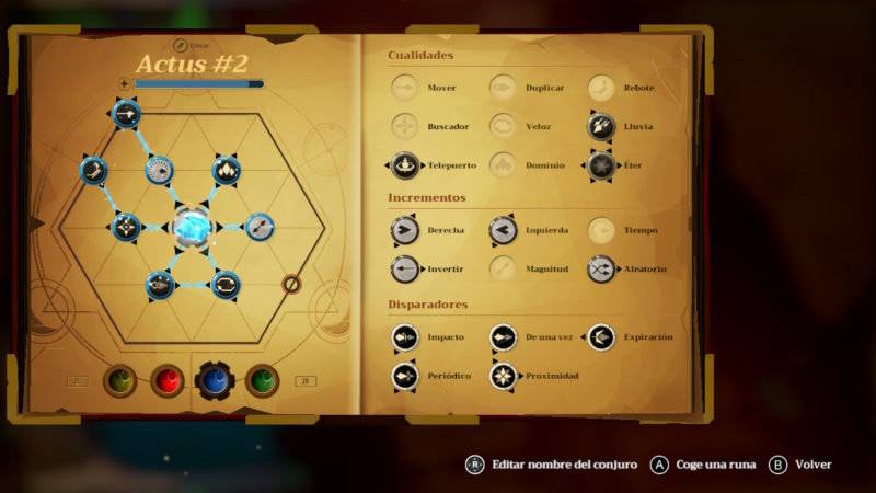 Para ello, deberemos ir recopilando distintas runas con la que otorgarles diferentes cualidades como magnitud, que hará que crezca de tamaño, impacto, que hará que al impactar con un enemigo se produzca otro hechizo de nuestra elección, o mover, que nos permitirá utilizar elementos como llamas estáticas para convertirlos en potentes bolas de fuego.