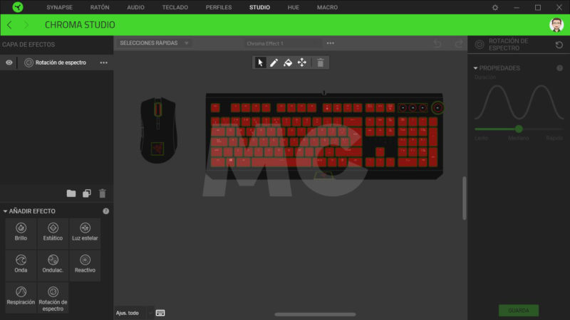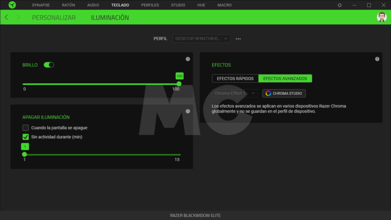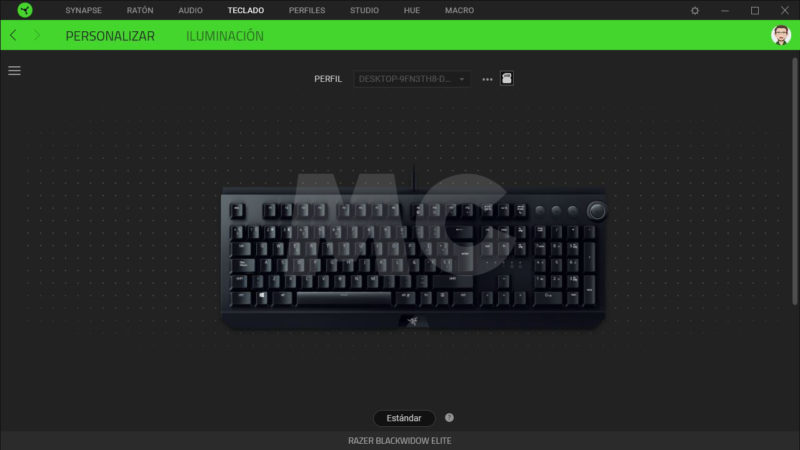 De nuevo tendremos que recurrir al software Razer Synapse para acceder a la configuración completa del teclado. Así pues, haciendo un repaso rápido, encontramos con una menor cantidad de opciones, reducidas a tan sólo dos pestañas desde las que podremos personalizar la asignación de teclas y el editor de macros y perfiles (los cuales podremos además almacenar en la memoria interna del propio teclado), y acceder a Chroma Studio, y las opciones de iluminación.