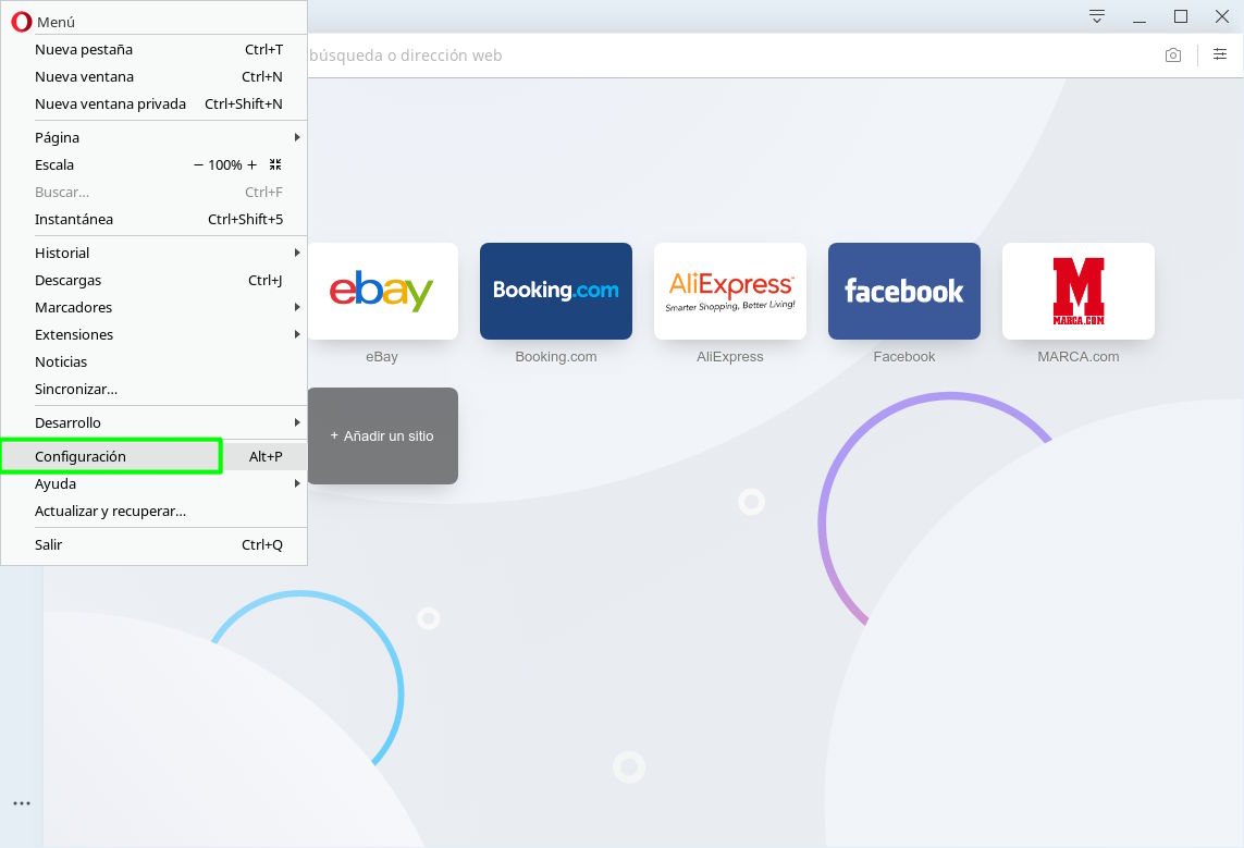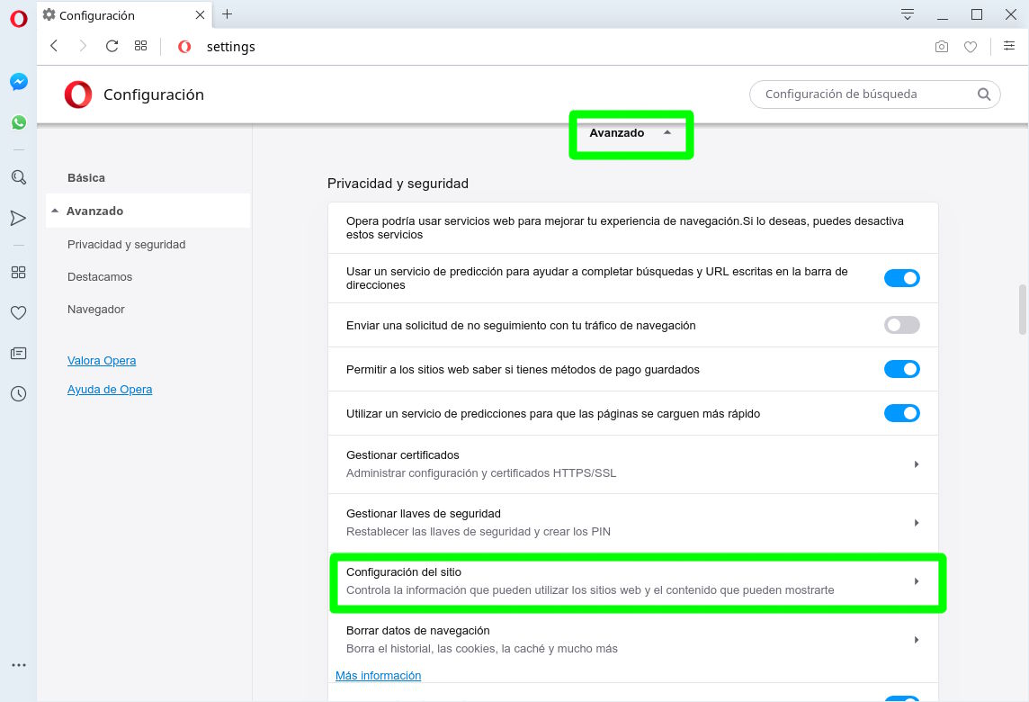 Para bloquear las cookies de terceros en Opera hay que seguir exactamente los mismos pasos que en Chrome, teniendo que ir primero a la Configuración de la aplicación, desplegar la configuración avanzada y después hacer clic en Configuración del Sitio.