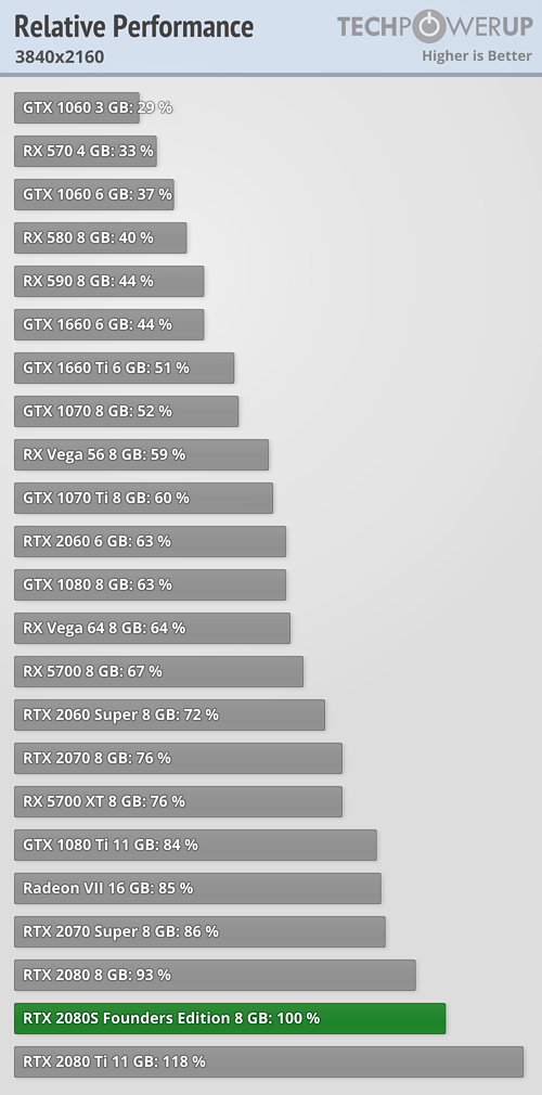 Como podemos ver en 1080p las diferencias frente a la RTX 2080 son mínimas, ya que es solo un 5% más potente que aquella, y también frente a la RTX 2080 Ti, puesto que pierde por apenas un 11%. Si subimos la resolución a 1440p las diferencias pasan a ser un 6% y un 16%, respectivamente, y en 2160p (4K) nos encontramos con un 7% y un 18%, también respectivamente.
