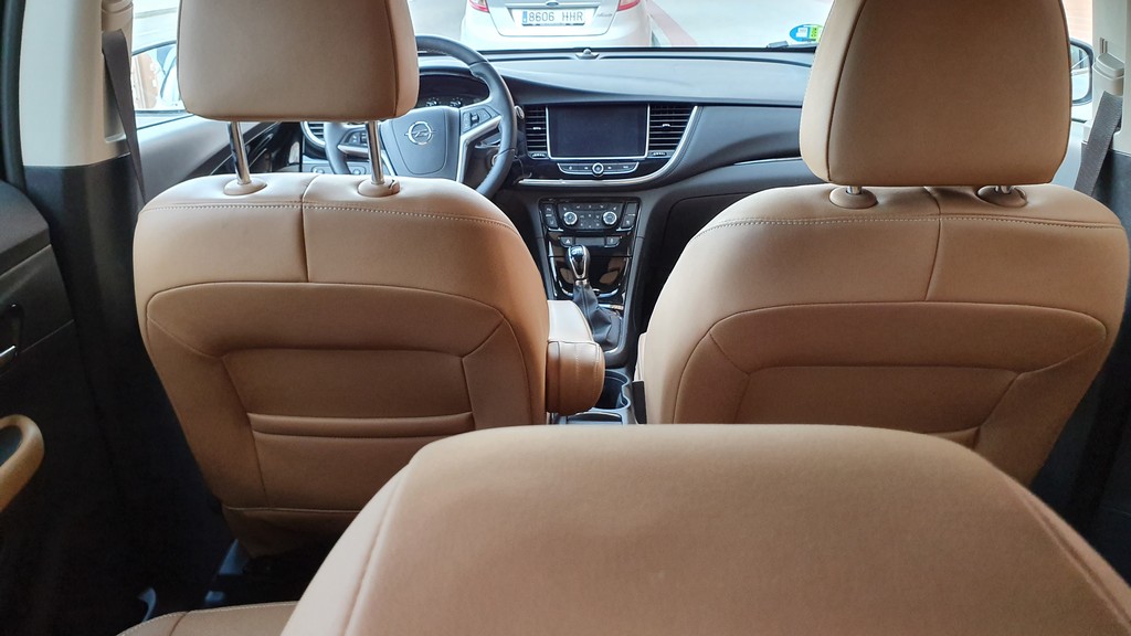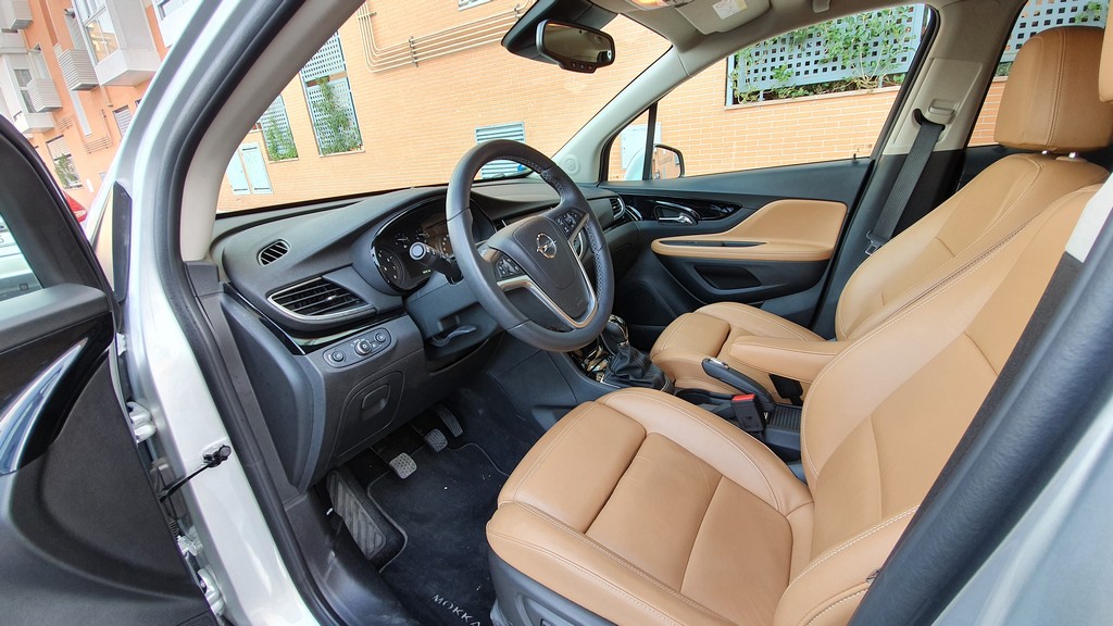 En el interior hay más cambios ya que el acabado del modelo que probamos es superior al del test que hicimos anteriormente. Esto nos da la ocasión de analizar un Mokka más «lujoso». Lo cierto es que el cambio es perceptible, sobre todo en lo que respecta a la tapicería en piel de color claro e inserciones en puntos estratégicos del interior con el mismo material como en el interior de las puertas y en los apoyabrazos.