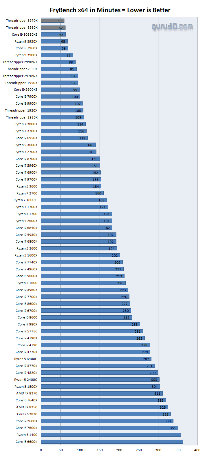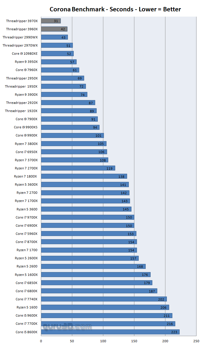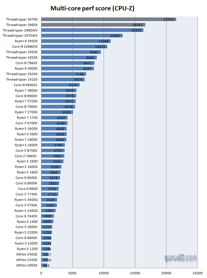 En el análisis que ha publicado Guru3D tenemos una gran cantidad de pruebas que dejan constancia de la gran mejora a nivel de rendimiento monohilo que ha logrado AMD frente a la generación anterior. Fijaos en las gráficas que acompañamos (podéis ampliarlas haciendo clic en ellas), en CPU-Z tenemos una diferencia de 61 puntos frente al Threadripper 2990WX.