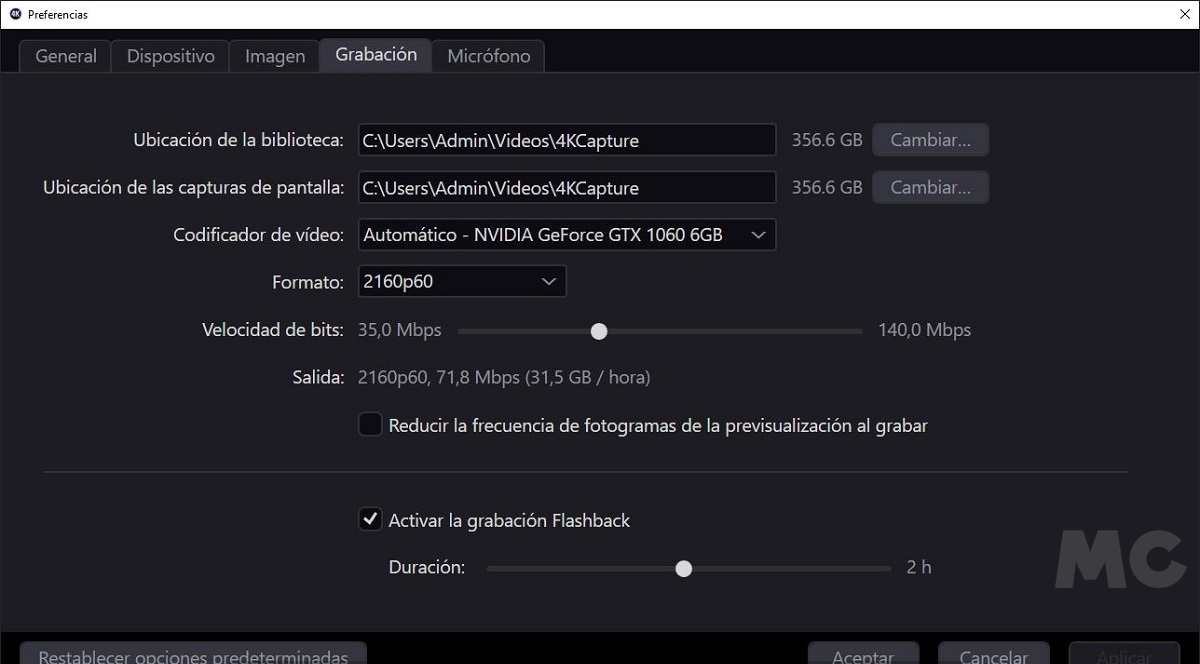 La aplicación dedicada de Elgato ofrece una experiencia de uso muy sencilla e intuitiva, y cuenta con todo lo que necesitamos para empezar a crear nuestros contenidos y grabaciones con calidad profesional y sin esfuerzo. Podemos elegir el destino donde queremos que se guarden los vídeos y ajustar diversas opciones. También tendremos la información que necesitamos para tener claro desde el primer momento cuándo espacio necesitaremos y personalizar la duración de la grabación «Flashback».