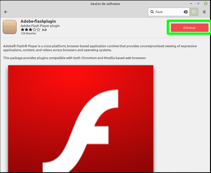 Después, en la aplicación, hay que buscar el paquete “Adobe-flashplugin” y pulsar sobre él con el botón principal del ratón.