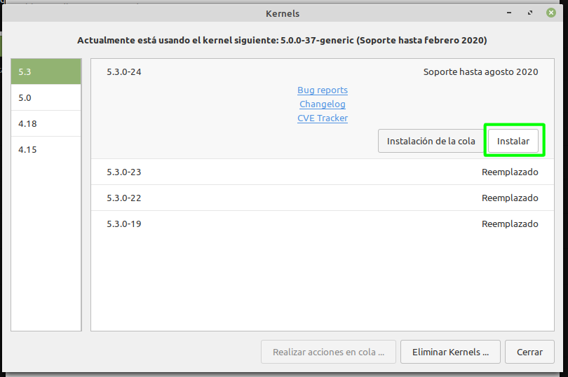 ¿Todavía más problemas? En caso de ser el ordenador muy reciente, el usuario puede encontrarse con componentes que no funcionan. Por ejemplo, las Wi-Fi de Intel son las mejor soportadas en Linux, pero si el modelo utilizado es muy reciente posiblemente no funcione con el kernel empleado por defecto. Afortunadamente, actualizar el kernel en Linux Mint es muy sencillo, requiriendo de tan solo ir al menú Ver > “Kernels de Linux” en el “Administrador de actualizaciones” para luego seleccionar el más reciente de todos los oficialmente suministrados. En nuestro caso hemos seleccionado Linux 5.3.0-24 (parte derecha) de la rama 5.3 (parte izquierda). Para aplicar los cambios instalados solo hay que reiniciar.