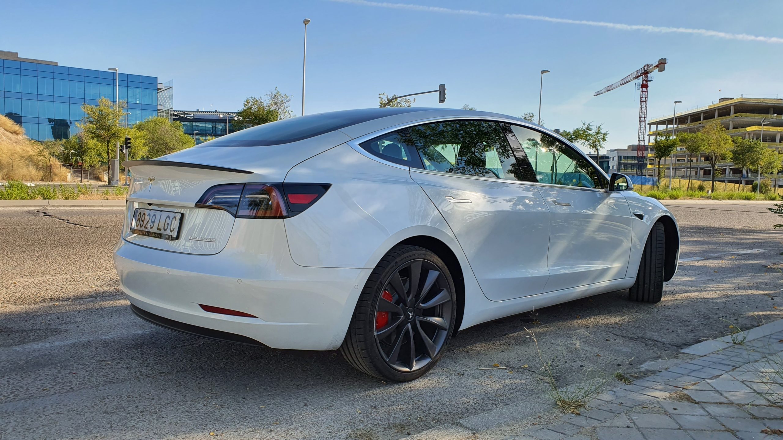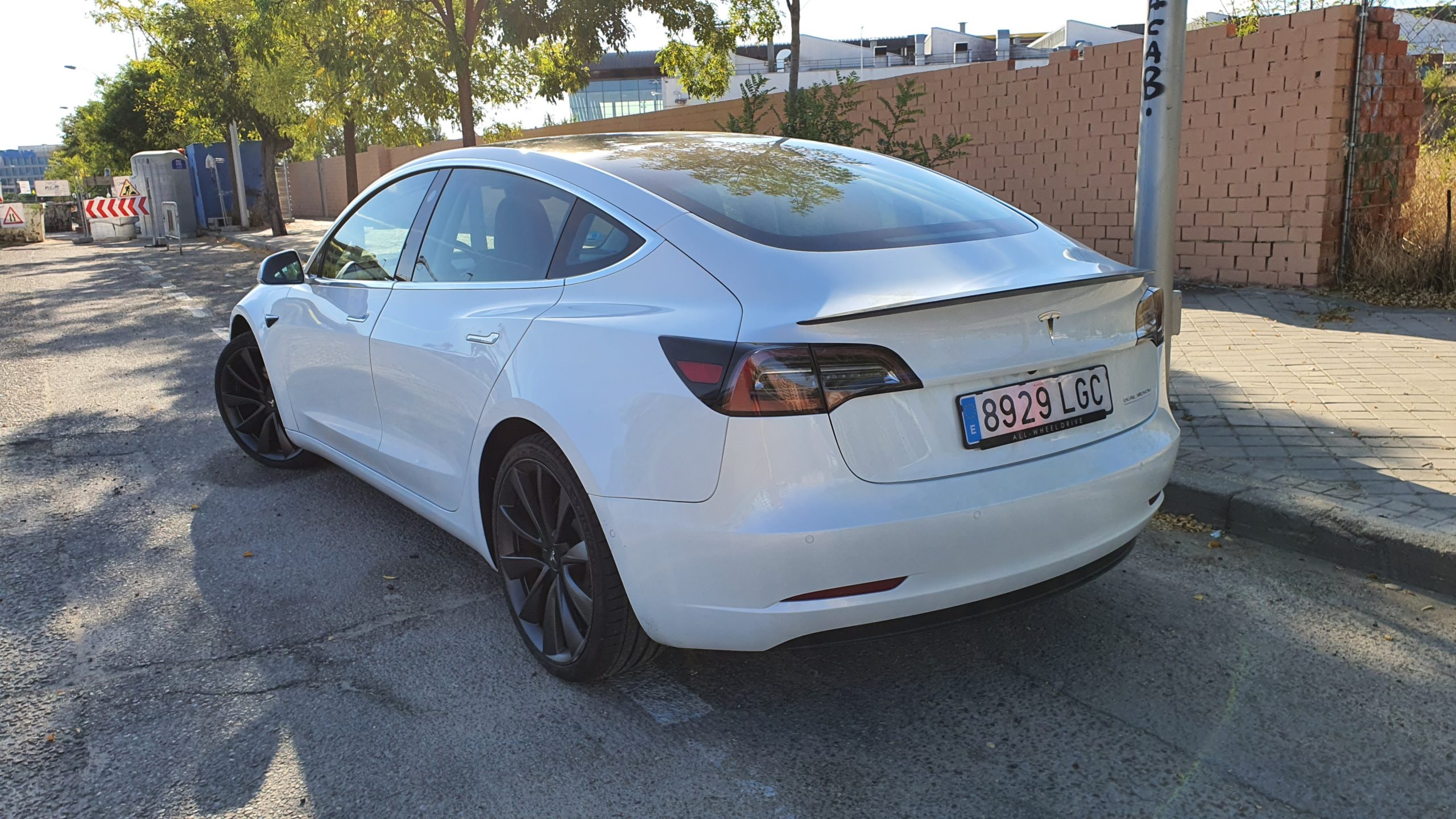 El aspecto exterior del Tesla Model 3 es el de una berlina con línea deportiva acentuada en nuestro caso por las llantas negras de 20 pulgadas y el alerón de fibra de carbono que montaba la unidad. Tiene un tamaño de 4,69 metros que se queda a medio camino entre un turismo de tamaño grande y mediano lo que no da muchas pistas a priori de su habitabilidad y aprovechamiento del espacio interior dada las peculiaridades de ser un vehículo eléctrico: por un lado el motor ocupa poco espacio y por el otro hay que encontrar sitio para las baterías. El tamaño del coche lo hace acomodarse mejor a lo que ofrece la competencia y proporciona por primera vez un Tesla con el que es cómodo moverse y maniobrar en ciudad.