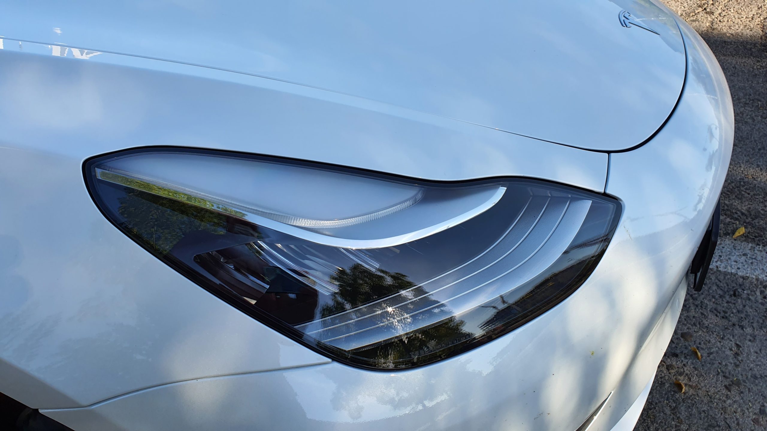 El morro del model 3 ofrece un aspecto inconfundible, principalmente por la ausencia de tomas de aire para refrigerar el motor, solamente se respeta la toma de aire bajo el parachoques, en este caso para llevar aire y enfriar las baterías. Los pilotos delanteros tienen forma de boomerang lo que junto con el diseño en forma de lágrima de los faros le proporcionan un aspecto moderno y no demasiado agresivo comparado con otras berlinas con aspiraciones dinámicas de la competencia.