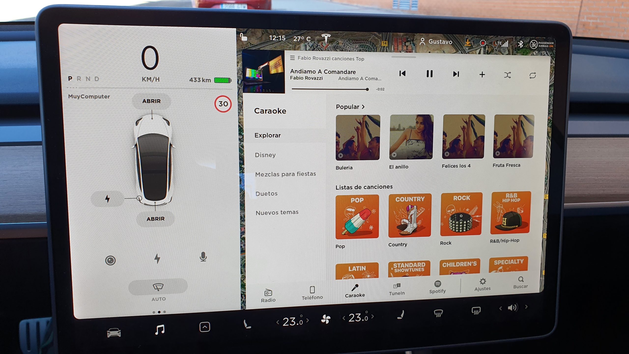 Desde la pantalla también podemos controlar el excelente sistema de audio y utilizar aplicaciones para escuchar música como Spotify o de vídeo como Youtube o Netflix (que por supuesto no podremos utilizar si el coche está en marcha). La conectividad la proporciona el propio coche con una SIM incorporada. Además de estas aplicaciones hay otras curiosas como la del Karaoke, que muestra letras en pantalla mientras suena la música para ir cantando en trayectos largos, además de varios juegos incorporados o incluso bromas y huevos de Pascua.