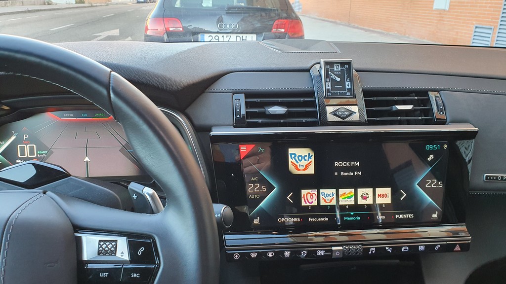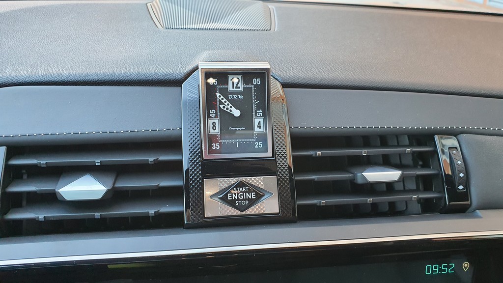 Entre las salidas centrales del sistema de ventilación encontramos el botón de arranque y un reloj analógico que dispone de un motor que lo oculta cuando apagamos y lo vuelve a mostrar al encender el coche. Un detalle de diseño curioso y que añade un toque más de exclusividad a este coche francés.