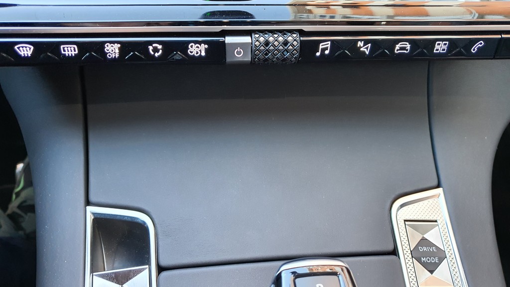 Debajo de la pantalla encontramos un conjunto de botones táctiles y en el centro una rueda para subir y bajar el volumen con un relieve que recuerda una vez más los rombos y triángulos que empapan todo el diseño del coche. Los botones al no tener relieve son difíciles de localizar si no se tiene práctica pero responden a la perfección y son muy numerosos, cosa a agradecer para no tener que estar navegando por los menús. Dispone de un botón independiente para acceder al menú del funcionamiento eléctrico del coche.