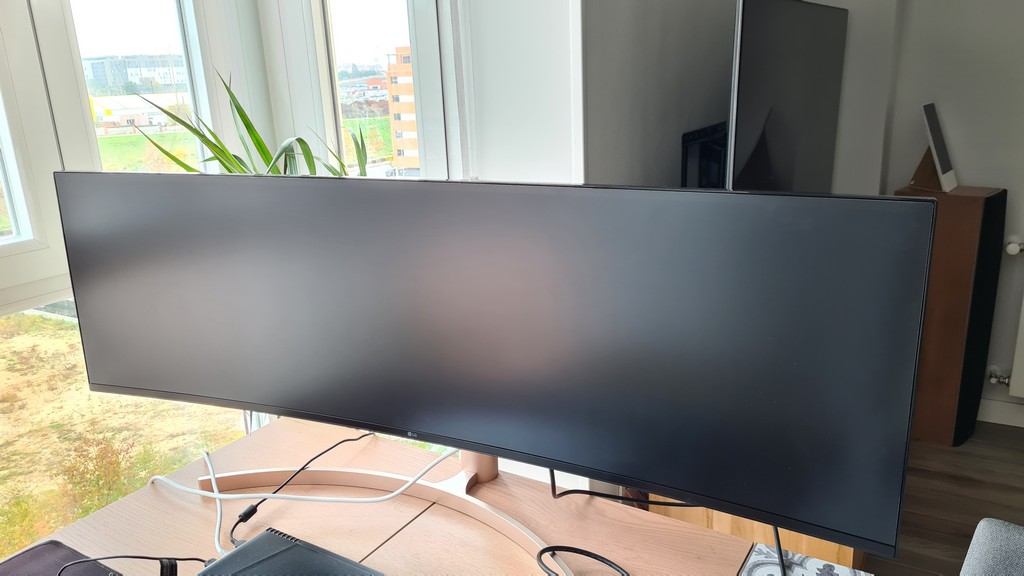 Una vez realizado el montaje, sencillo si no fuera por el peso (más de 15 kilos con peana) afrontaremos el segundo desafío que es simplemente encontrarle sitio. No todas las mesas de trabajo pueden acoger un monitor que ocupa 121 centímetros de ancho. Y una vez encontréis esa mesa comprobad que las ventanas pueden abrirse sin problemas (también he pasado por eso). Una vez colocado el monitor encontrar la posición de trabajo es sencilla pues se puede subir y bajar así como rotar e inclinar hasta 15 grados (siempre con mucha precaución).