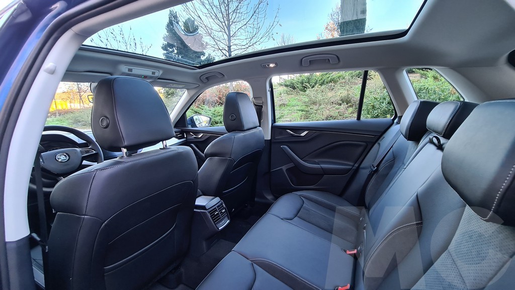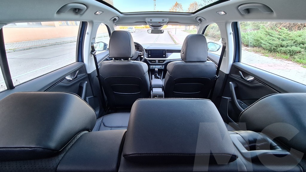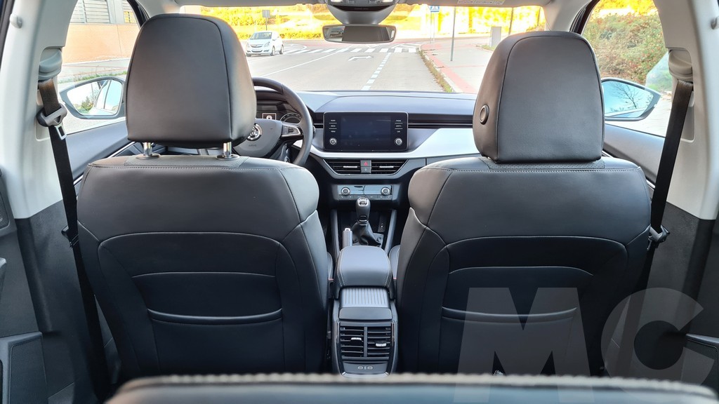 En la parte trasera, tal y como sucedía en el Scala, encontramos mucho espacio accesible de forma fácil gracias a que la apertura de la puerta es grande y la facilidad añadida que proporciona la carrocería tipo SUV que es más elevada. Es notable cómo pueden acomodarse personas de buena estatura con comodidad, tanto por altura como espacio para las piernas. En anchura como es habitual dos viajan bien y un tercero algo estrecho. No es posible inclinar los respaldos ni inclinar la banqueta trasera pero son funciones que se encuentran en SUV de tamaño más grande habitualmente.