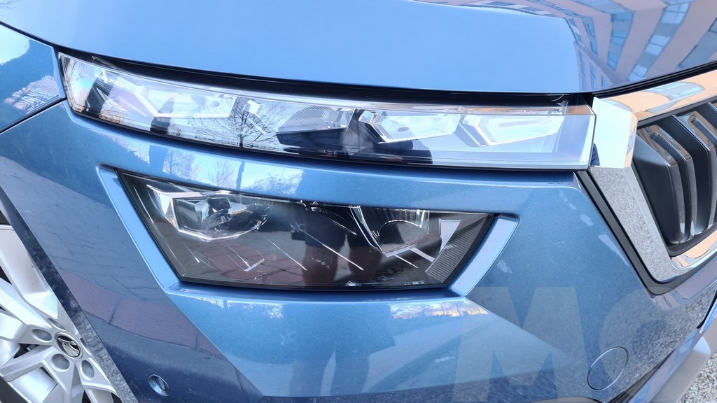El aspecto exterior del Kamiq está inspirado en las líneas de los SUV de la empresa checa con un aire indudable inspirado en el Kodiaq. Lo que más resalta es la parte frontal con mucha personalidad y unos característicos grupos ópticos divididos en dos partes: una franja estrecha en la parte superior (más estilizado y moderno que en el Kodiaq) y un segundo elemento junto a esta con forma trapezoidal. La parrilla central está pintada en negro con un borde cromado que también añade personalidad.