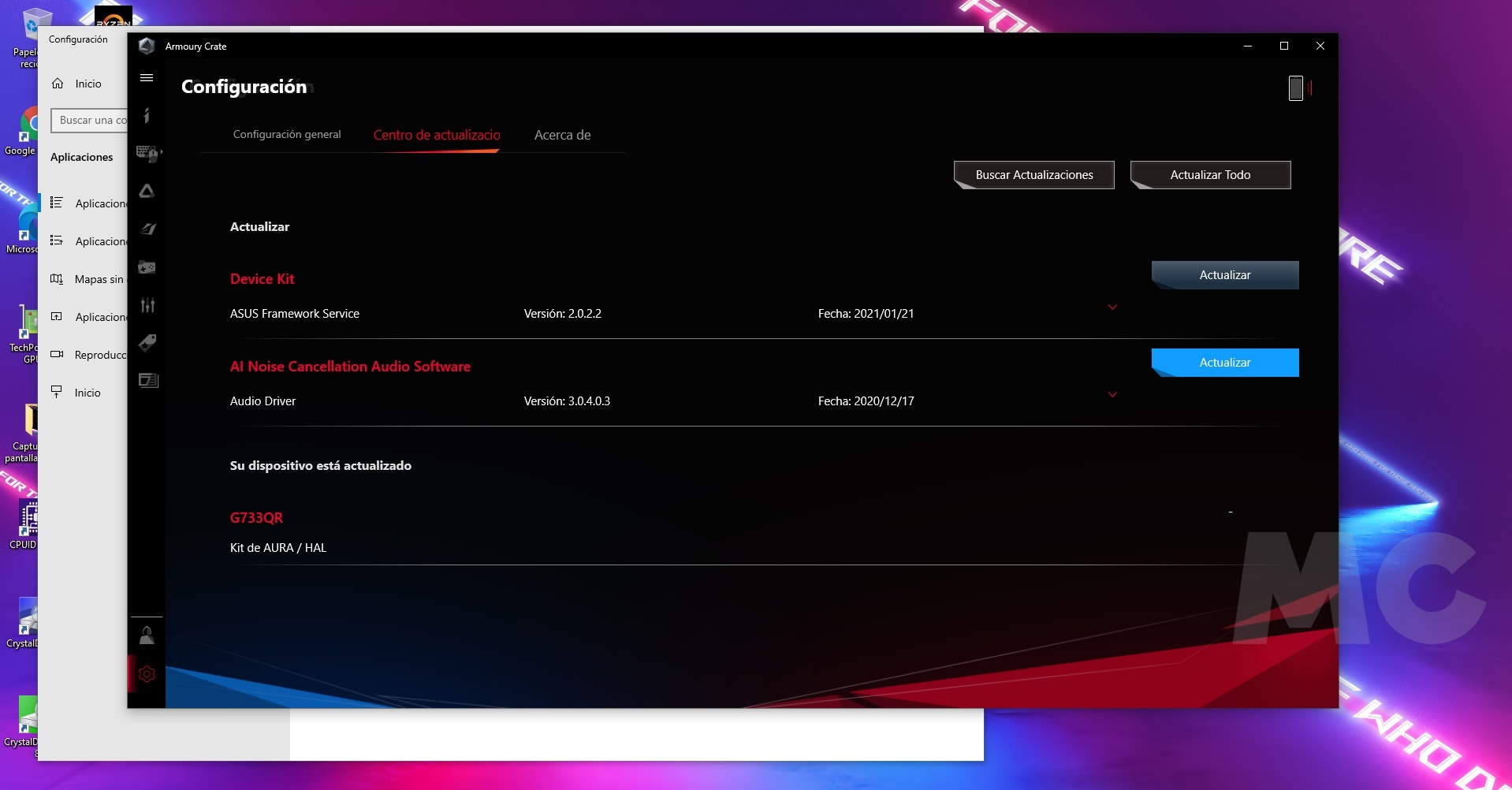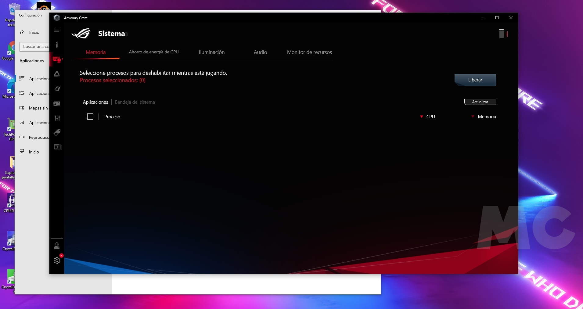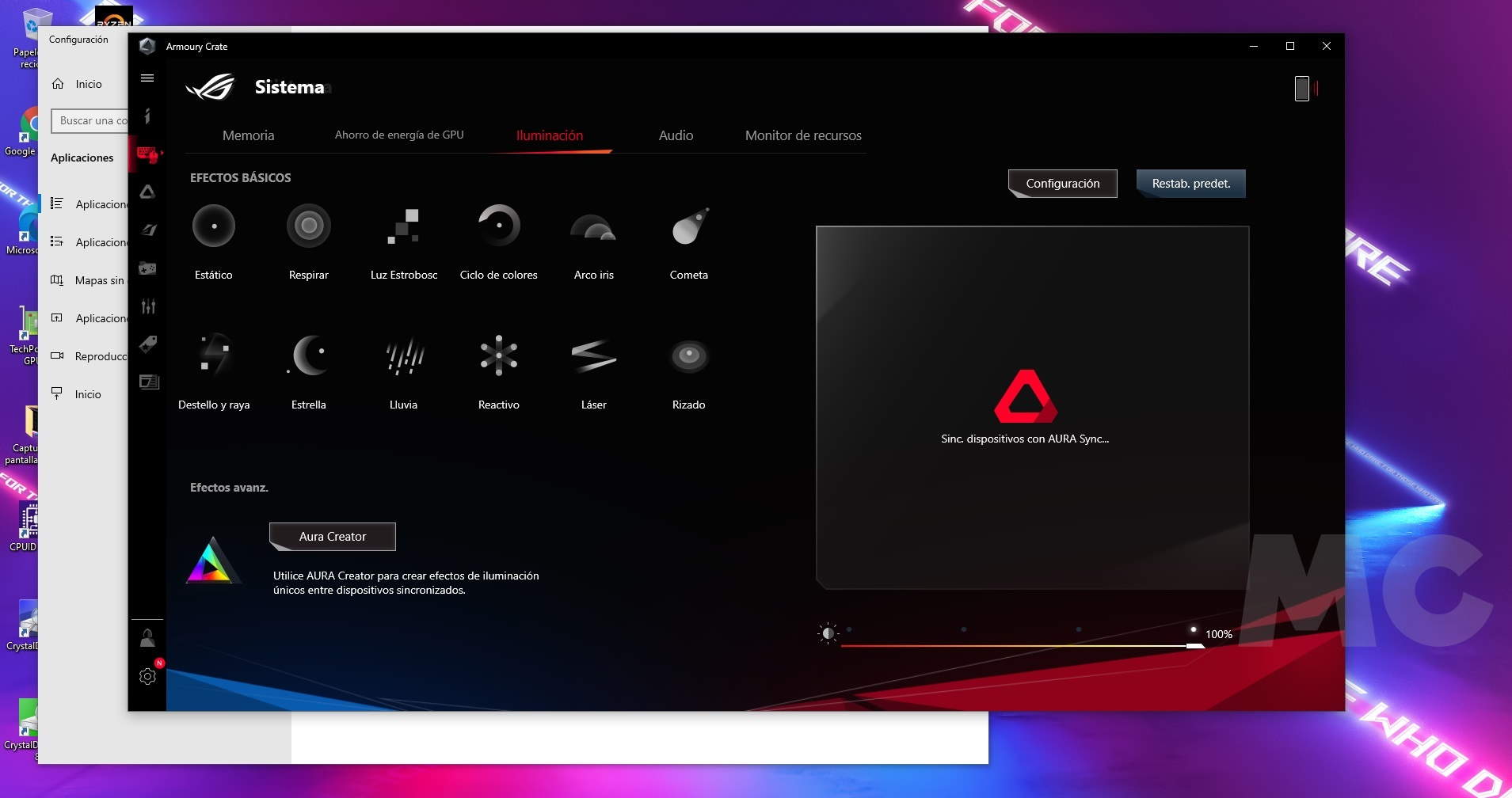 La calidad del sistema de iluminación LED RGB es sobresaliente, y como hemos anticipado podemos personalizarlo de una manera muy sencilla, gracias a la herramienta Armoury Crate de ASUS, que es totalmente gratuita, y que nos permitirá también monitorizar el estado del portátil, vigilar las temperaturas de trabajo, controlar otros aspectos importantes, como la tasa de uso de la CPU y de la GPU.