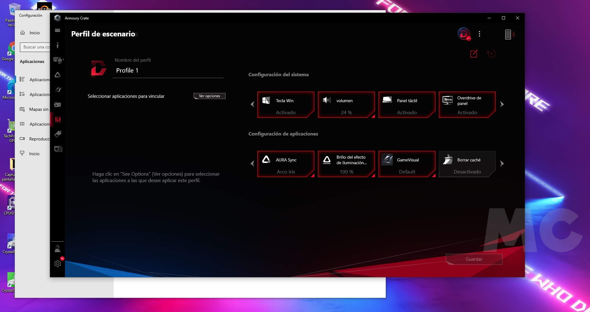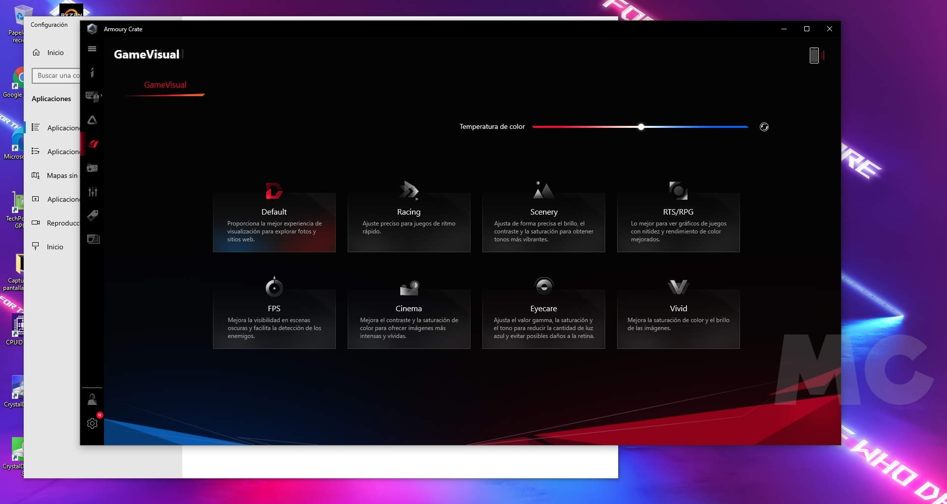 En mi caso, la representación de colores que más me ha gustado ha sido el ciclo arcoíris, ya que queda realmente bien y no nos lleva a esa monotonía en la que podríamos incurrir al utilizar un color estático. Como siempre, esto es cuestión de gustos. Si vosotros tenéis otras preferencias no hay problema, podréis cambiar por completo la iluminación LED RGB a través del software «Armoury Crate», de ASUS. Dicho software también permite controlar y visualizar el estado del ASUS ROG Strix SCAR 17, y realizar numerosos ajustes, como podemos ver en las imágenes adjuntas.
