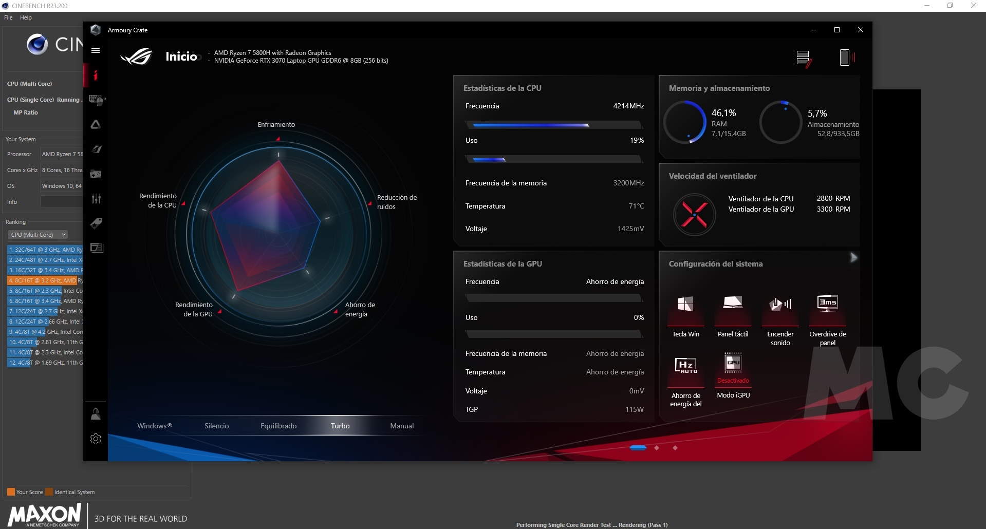 Funcionando con un núcleo activo, el Ryzen 7 5800H ha sido capaz de mantenerse por encima de los 4,2 GHz sin problema, registrando una temperatura de 71 grados. En multihilo, y trabajando a plena carga (100% de uso de la CPU), la temperatura se ha mantenido en 100 grados, y las frecuencias de trabajo oscilaban entre los 3.905 y los 3.944 MHz. A pesar de lo elevada que resulta esa temperatura, el equipo no ha dado problemas de «thermal throttling» ni de estabilidad en ningún momento.