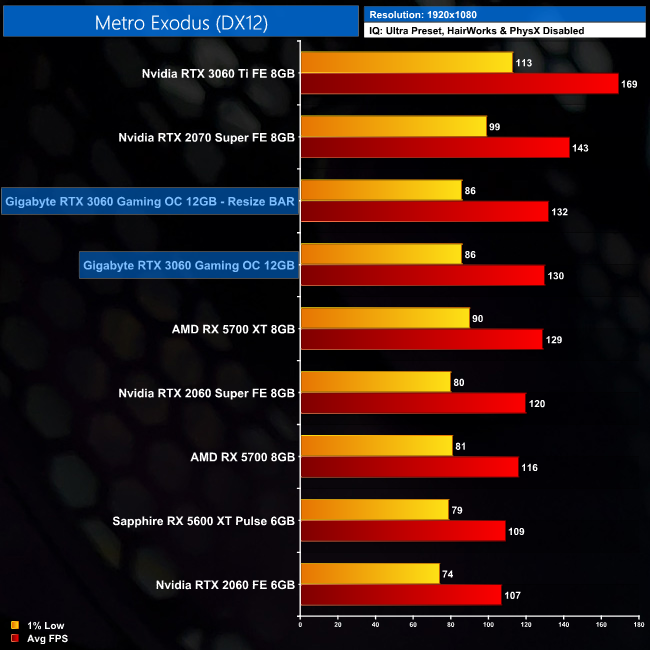 En Metro Exodus, con trazado de rayos y resolución 1080p, la GeForce RTX 3060 logra 73,7 FPS, mientras que la RTX 2070 registra 66,6 FPS, según las pruebas de TechPowerUP! Al subir la resolución a 1440p, la GeForce RTX 3060 logra superar a la RTX 2070 Super, aunque en 4K queda por detrás de la RTX 2070. Muy curioso. De media, podemos confirmar que la GeForce RTX 3060 es más potente que la RTX 2070 en trazado de rayos, y también parece utilizar de forma un poco más eficiente el DLSS 2.0, ya que mejora un poco más el rendimiento (comparada con la RTX 2070).