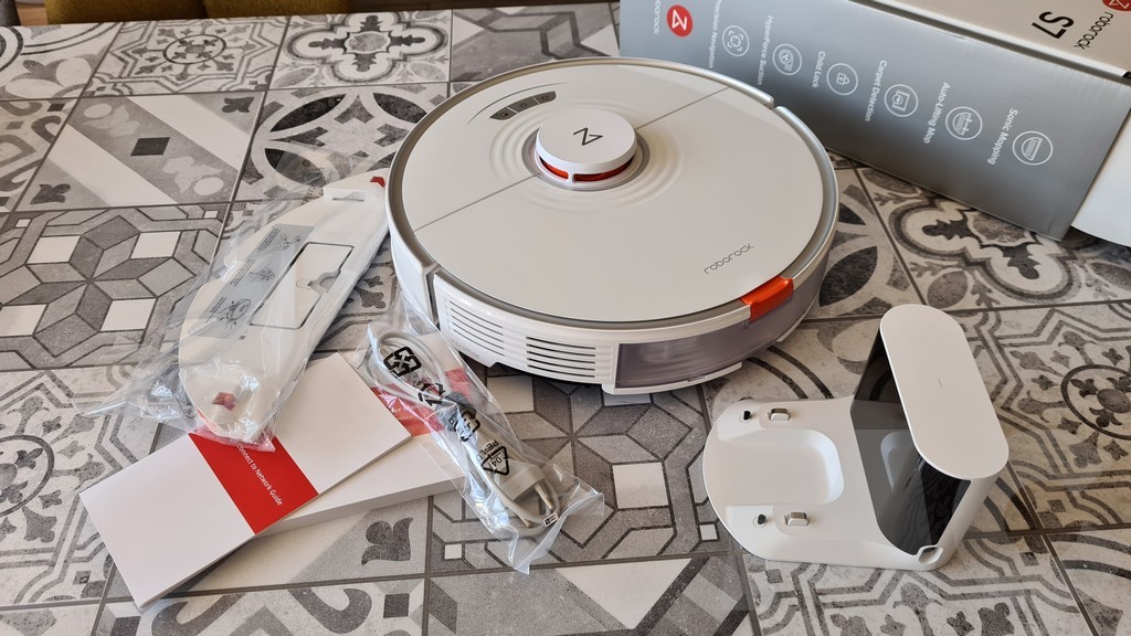 Echando un vistazo a las características técnicas se parecen mucho a las del S6 Max V salvo un peso sensiblemente superior y un pequeño aumento de la capacidad del depósito de desperdicios y el de agua. Al abrir la caja nos encontramos con todas las piezas habituales: el robot, la base de carga, el cable de conexión y la mopa que en este caso tiene un diseño especial por el sistema Vibra Rise de la mopa/paño de fregado. Estas pieza se coloca solamente si queremos que el robot pueda fregar y la pieza de tela se separa mediante un velcro y una guía para que podamos lavarla periódicamente.