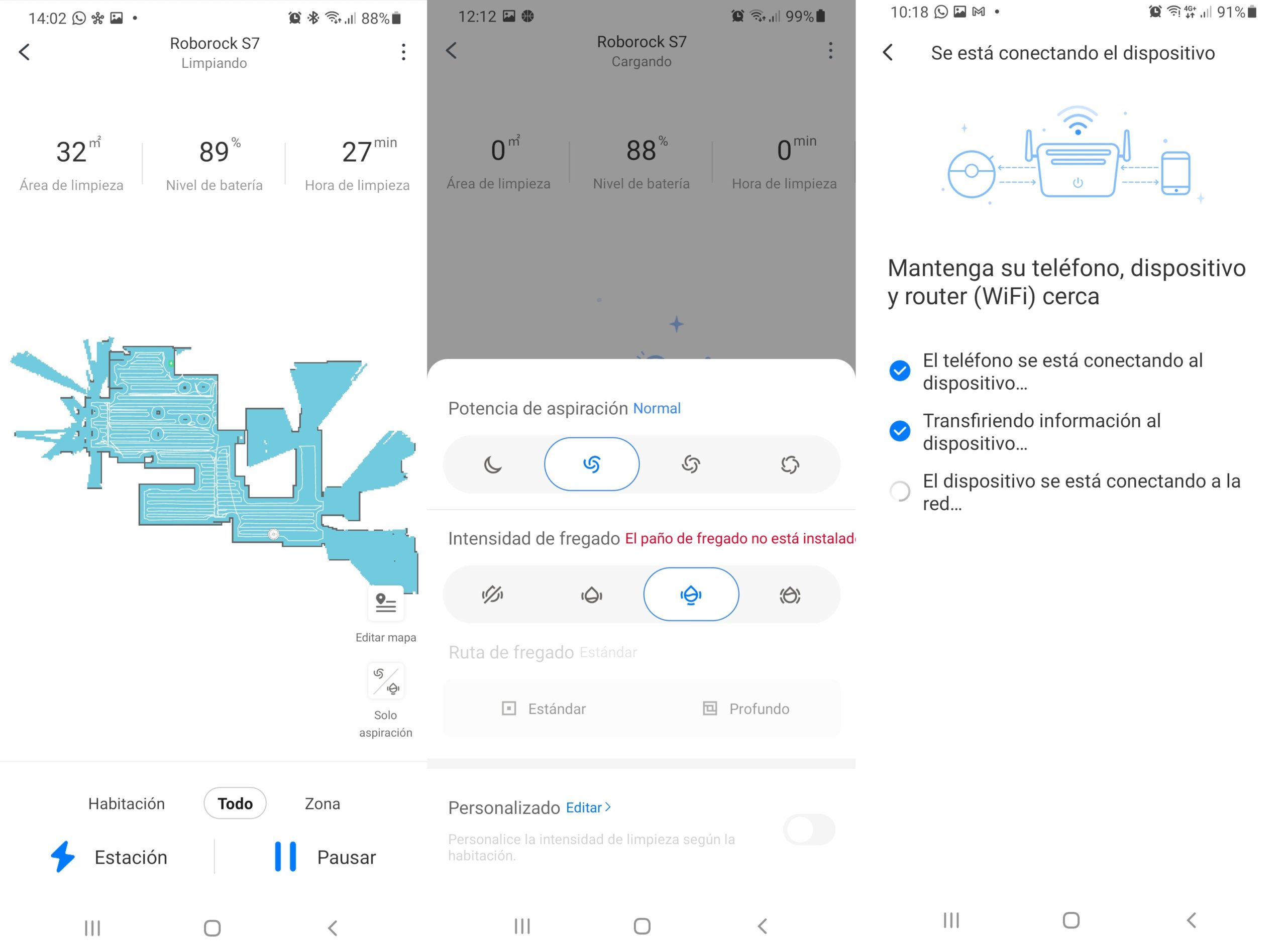 En la aplicación podemos elegir distintas intensidades de fregado (leve, moderado o intenso) y dos tipos de ruta, la ruta estándar o la ruta profunda. En este último caso, recomendado solamente para suelos recién barridos, el robot hará rutas en zig zag muy estrechas para asegurarse de que el suelo queda limpio. No hemos notado ninguna diferencia de ruido, es decir, el del aspirado tapa el que produce la vibración de la mopa. La velocidad es algo menor que si solamente aspiramos y mucho mayor si elegimos la trayectoria intensa.