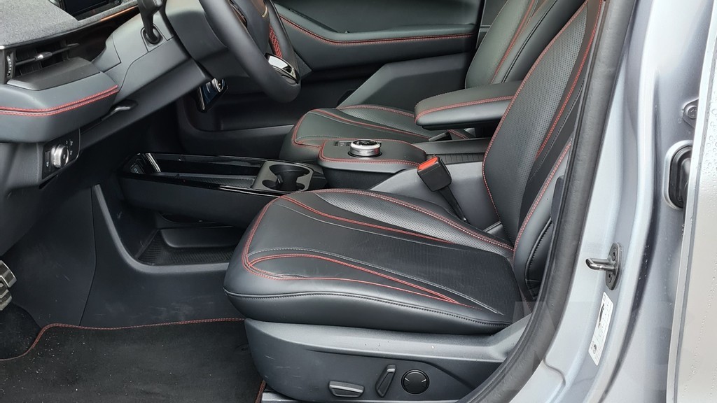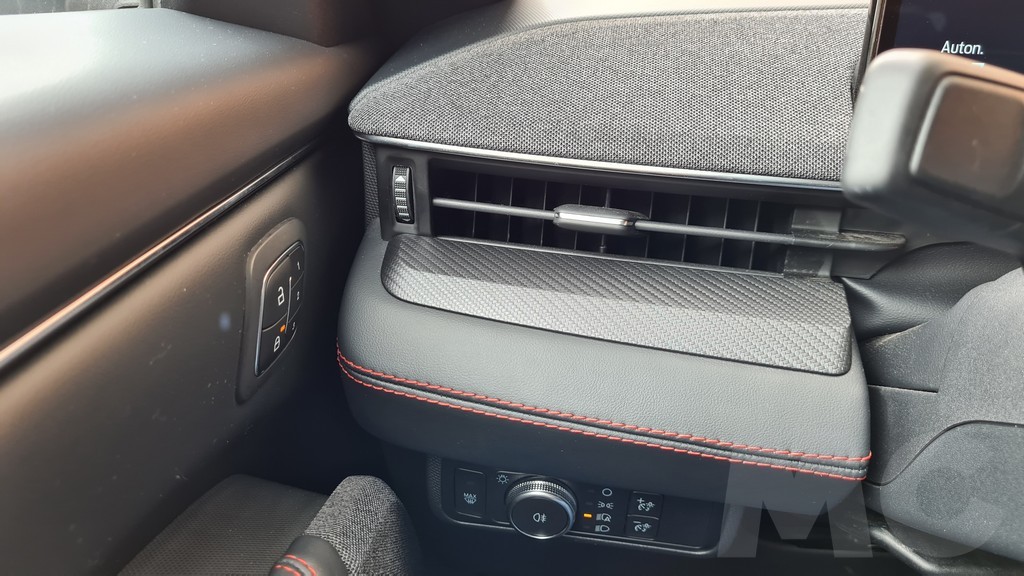 Sobre la consola encontramos el selector del cambio en forma de rueda junto al interruptor del freno de mano. Todo a una altura cómoda para apoyar el brazo y poder accionarlo sin dificultad. Debajo del reposabrazos central otro hueco que se une a los de las puertas para ofrecer mucho espacio para depositar objetos dentro del habitáculo. En general todo parece estar en su sitio y a diferencia de lo que pasa en un Tesla encontramos algunos mandos para no tener que recurrir demasiado a los menús de la pantalla central (aunque funciones como la climatización sí que tendremos que hacerlo).
