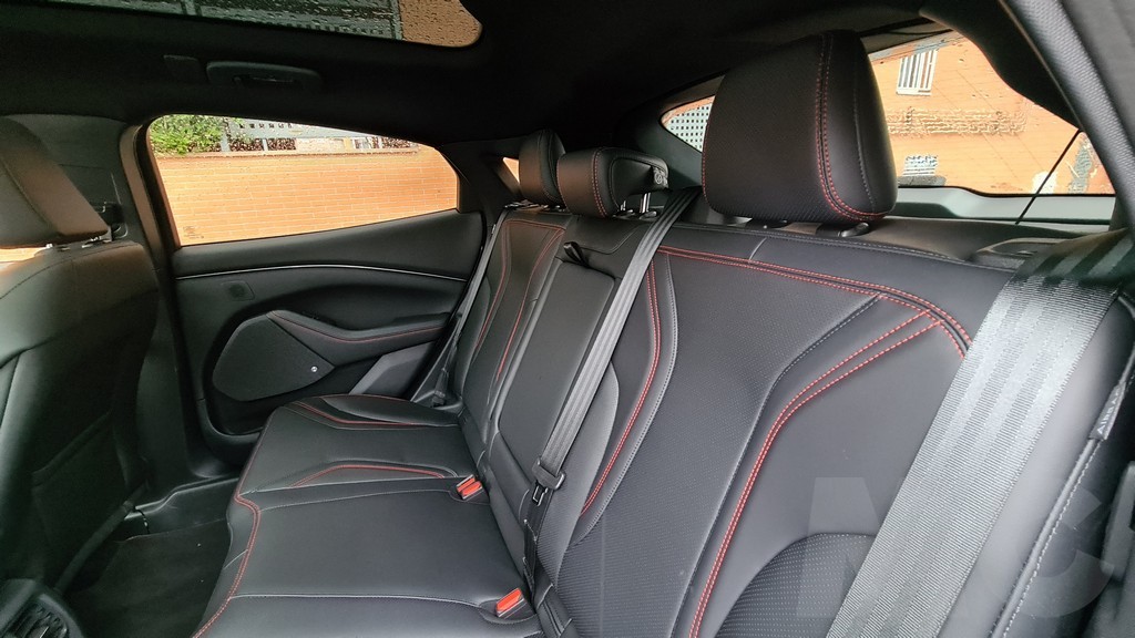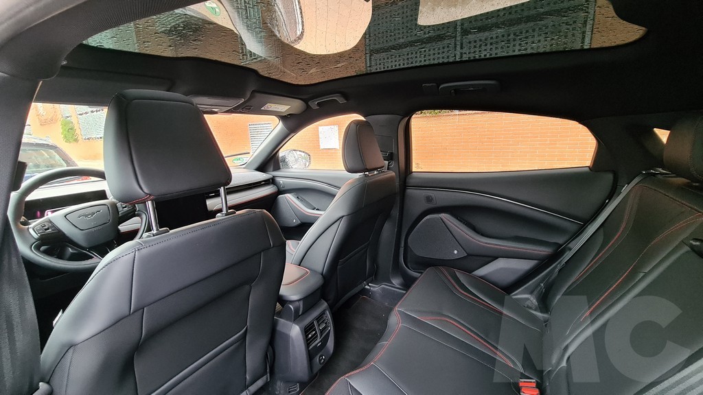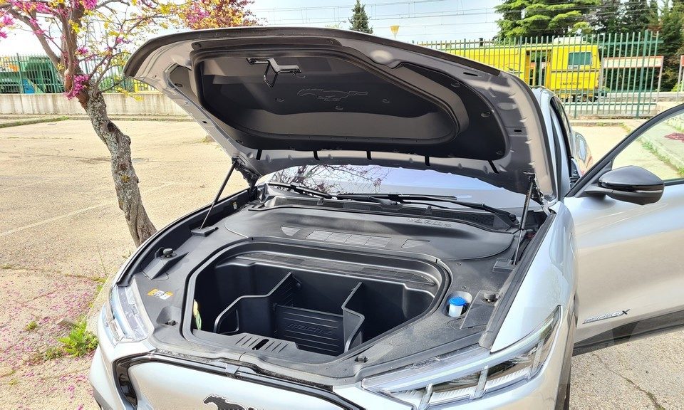 En la parte posterior el espacio también es grande y puede acoger a adultos de buena estatura sin problemas de espacio para las piernas. El espacio parece aún más grande gracias al amplio techo solar que permite que entre la luz dentro del coche. Este Mustang al igual que los modelos de Tesla (otro guiño más) dispone de dos maleteros de buen tamaño. El trasero tiene una capacidad de 402 litros y un volumen muy regular lo que facilita la carga de bultos. El delantero también es bastante grande, 81 litros, y está compartimentado mediante piezas de plástico que pueden retirarse.