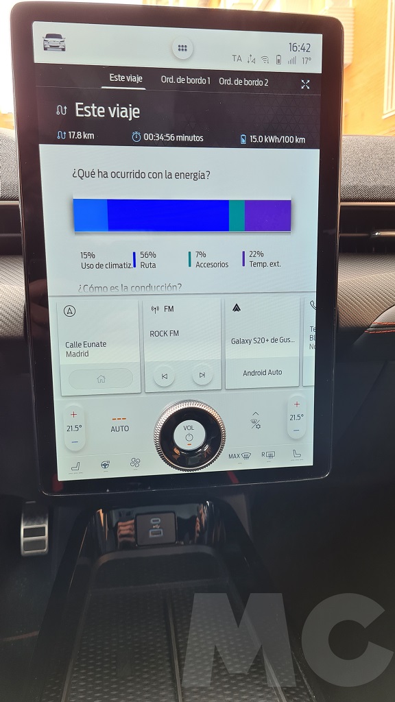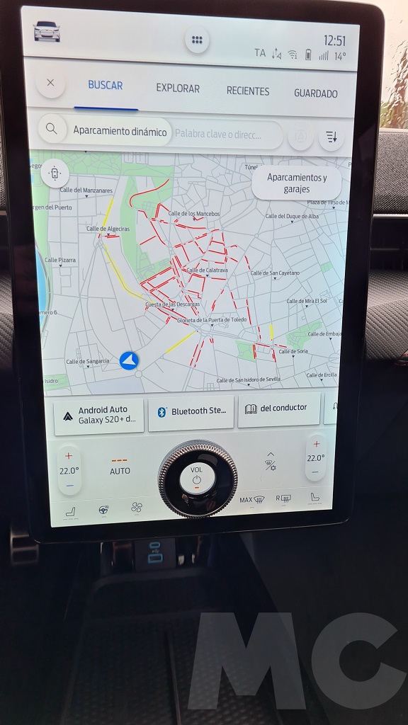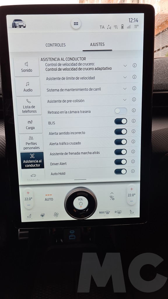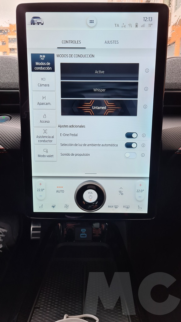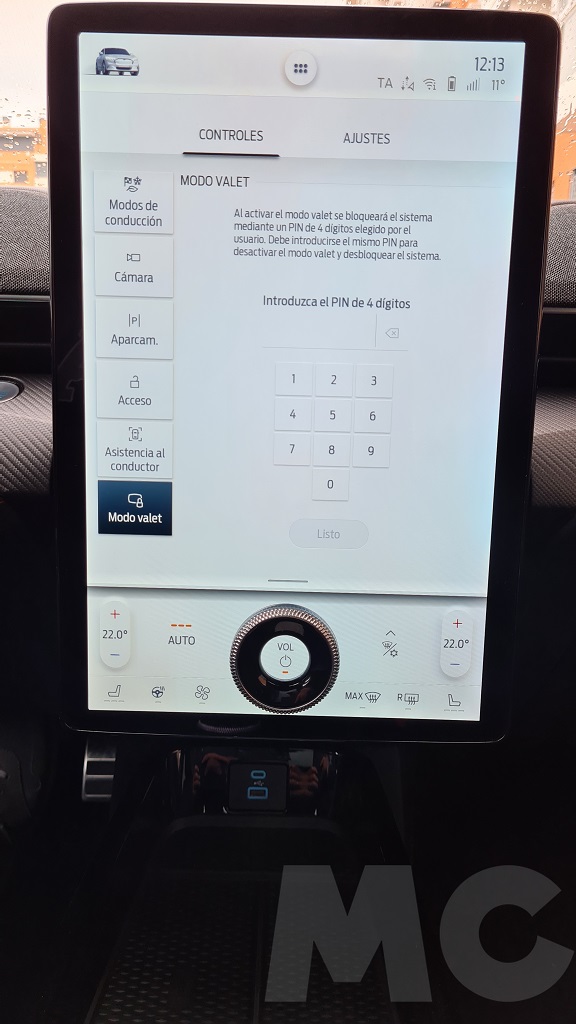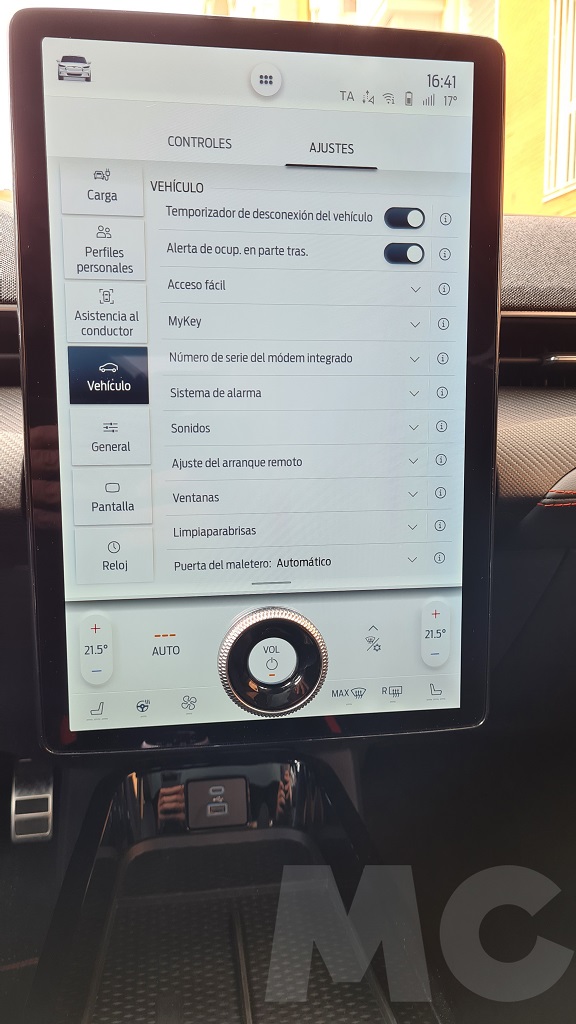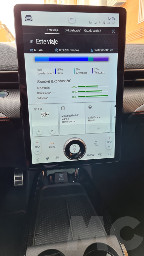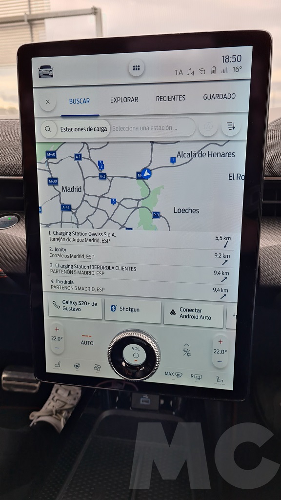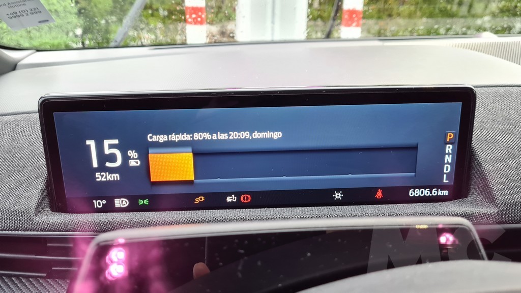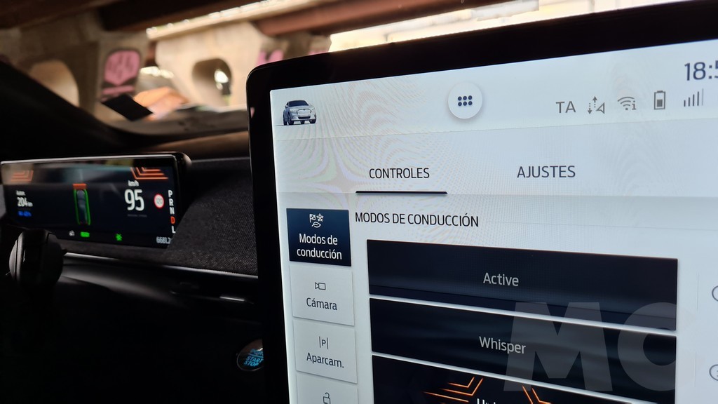 Para explorar todas las opciones del sistema no tuvimos demasiado tiempo pero podemos desde cambiar el comportamiento del coche (susurro, activo o desatado), activar la función de conducción con un sólo pedal, activar el sonido de propulsión (para sentir que estamos a los mandos de un «verdadero» Mustang), configurar acceso sin llave para invitados, los sistemas de conducción autónoma, el navegador con opción de buscar puntos de carga o incluso aparcamiento «dinámico»… Y por supuesto información de todo tipo y muy completa, sobre todo en lo que respecta al consumo y las opciones de recarga programada.