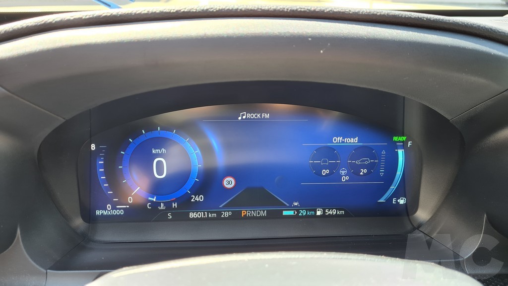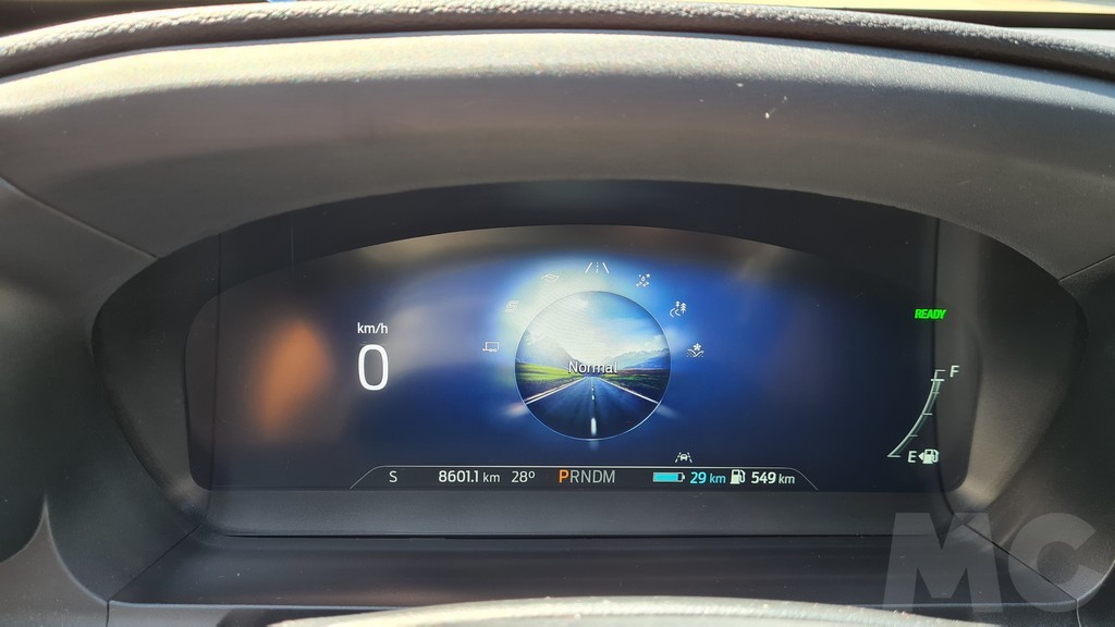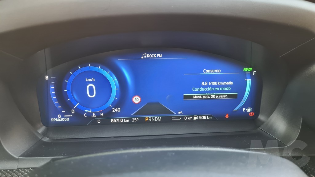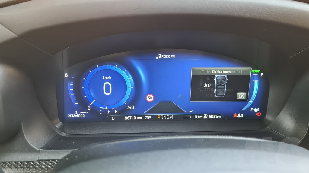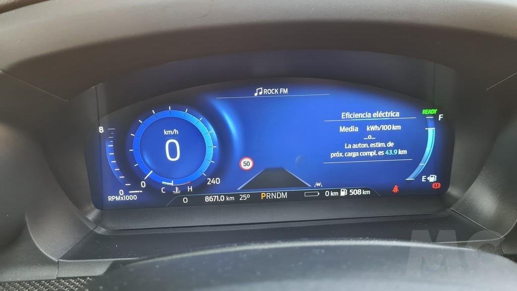 La capacidad de la batería la podemos ver en un pequeño indicador en la parte inferior del display donde también se muestra la autonomía de los dos sistemas (combustible y eléctrico) kilómetros recorridos, marcha seleccionada y temperatura ambiente. La visibilidad del panel es muy buena y aunque es más sencillo que el de otros modelos se complementa bastante bien con la pantalla del sistema de información y entretenimiento del salpicadero.