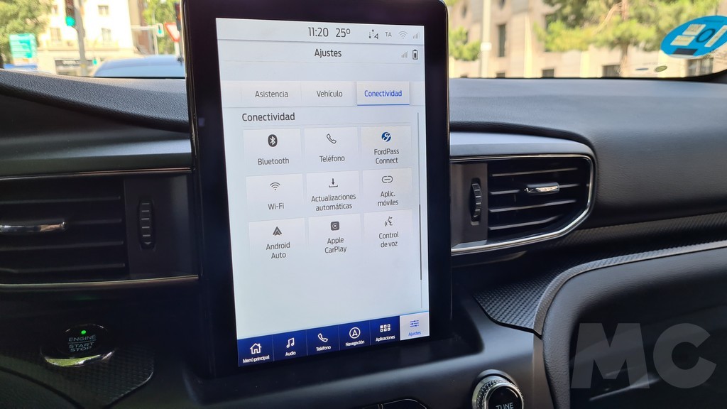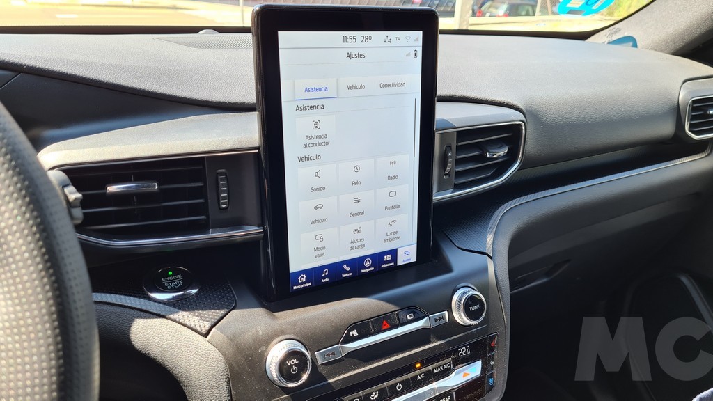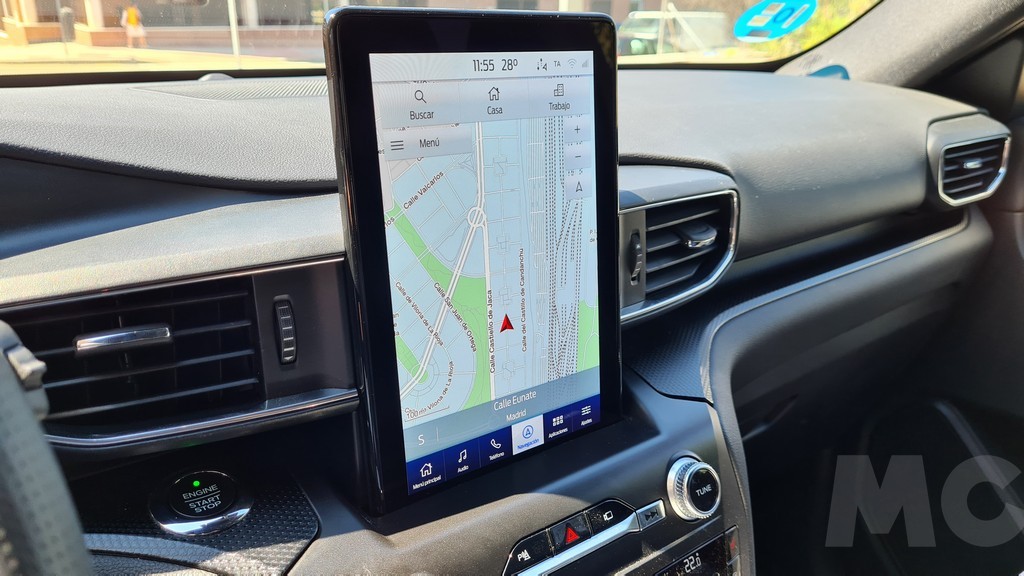 En el salpicadero del Explorer domina una imponente pantalla colocada en sentido vertical de 10,1 pulgadas con una disposición parecida a la del Mustang Match-E que pudimos probar pero con un sistema y unos mandos distintos (no tiene el dial «incrustado») pero muy completo en las funciones que permite realizar y con una excelente visibilidad. Especialmente destacable es la navegación que con una pantalla vertical tan generosa es muy eficaz aunque a veces tarde un poco en responder.