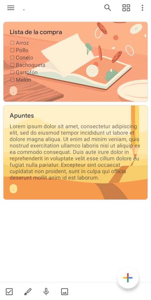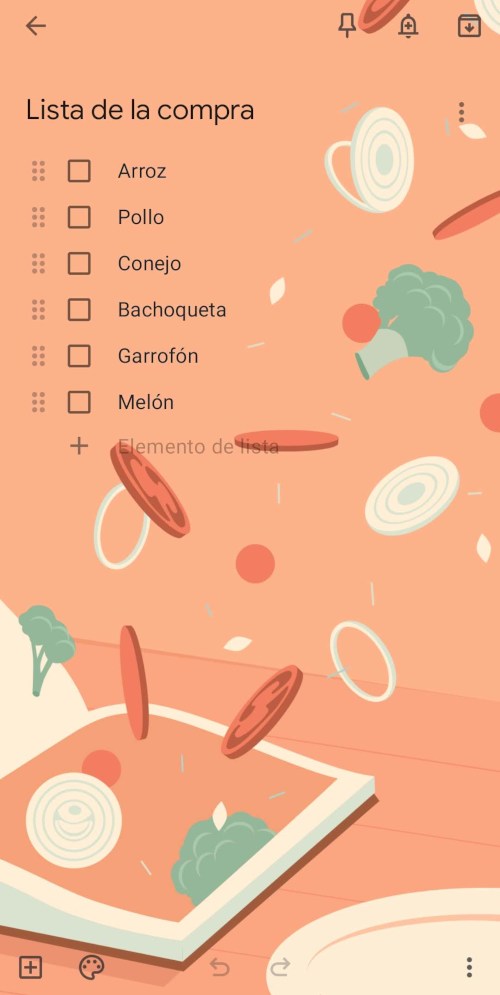 La selección de motivos para los notas es finita, se echan de menos más diseños, pero es elegante y casa con algunos de los propósitos a los que puede servir Google Keep al común de los mortales, como por ejemplo hacer la lista de la compra (es especialmente útil para esta actividad, porque tiene un autocompletado de productos de lo más completo).