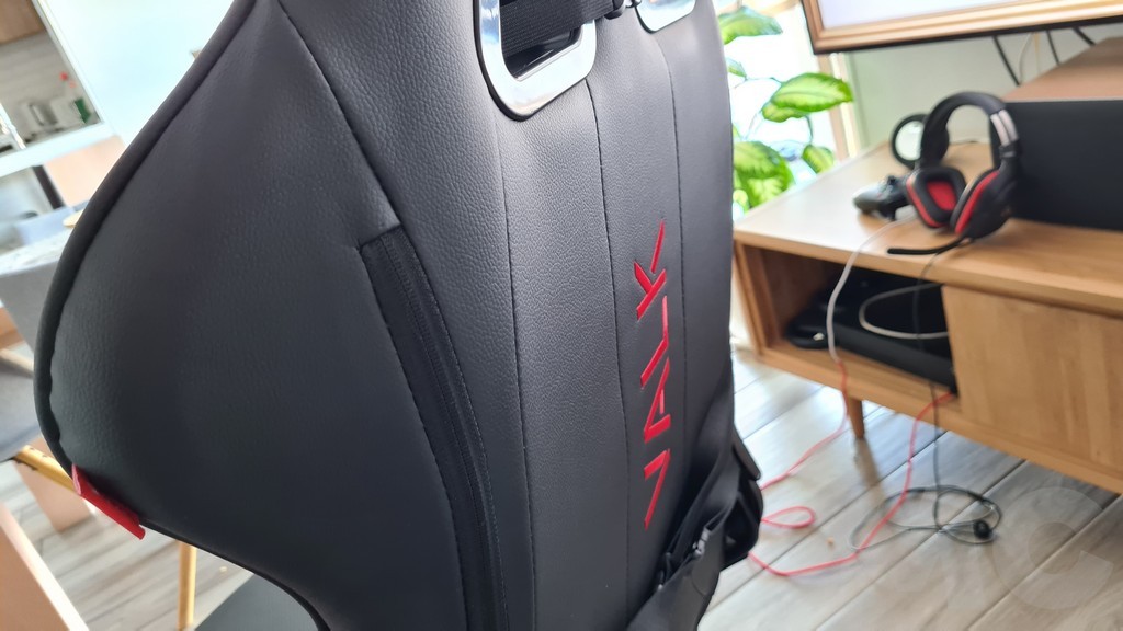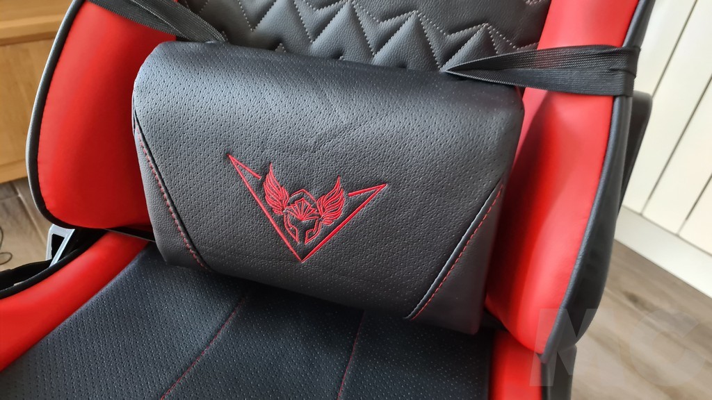 Una vez montada la silla también incorporaremos los cojines: uno para la cabeza y otro para la zona lumbar. Se colocan de forma sencilla con unas cintas que se cierran con un sistema similar al que se utilizan para las mochilas y que permiten ajustar su posición o retirarlos si es necesario. Tanto en los cojines como en el asiento y el respaldo el material es de piel sintética con perforaciones para facilitar la ventilación con un tacto muy agradable y unos acabados que nos han parecido de muy buena calidad con costuras bien rematadas. La silla está decorada con el logotipo de la marca en el reposacabezas y el nombre en la parte posterior del respaldo.
