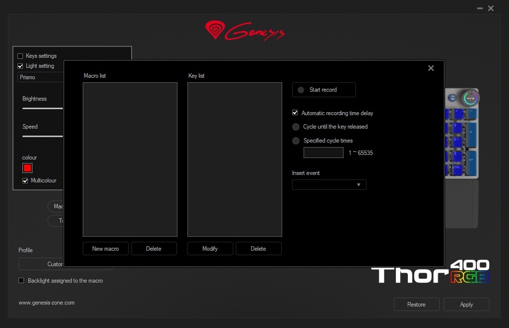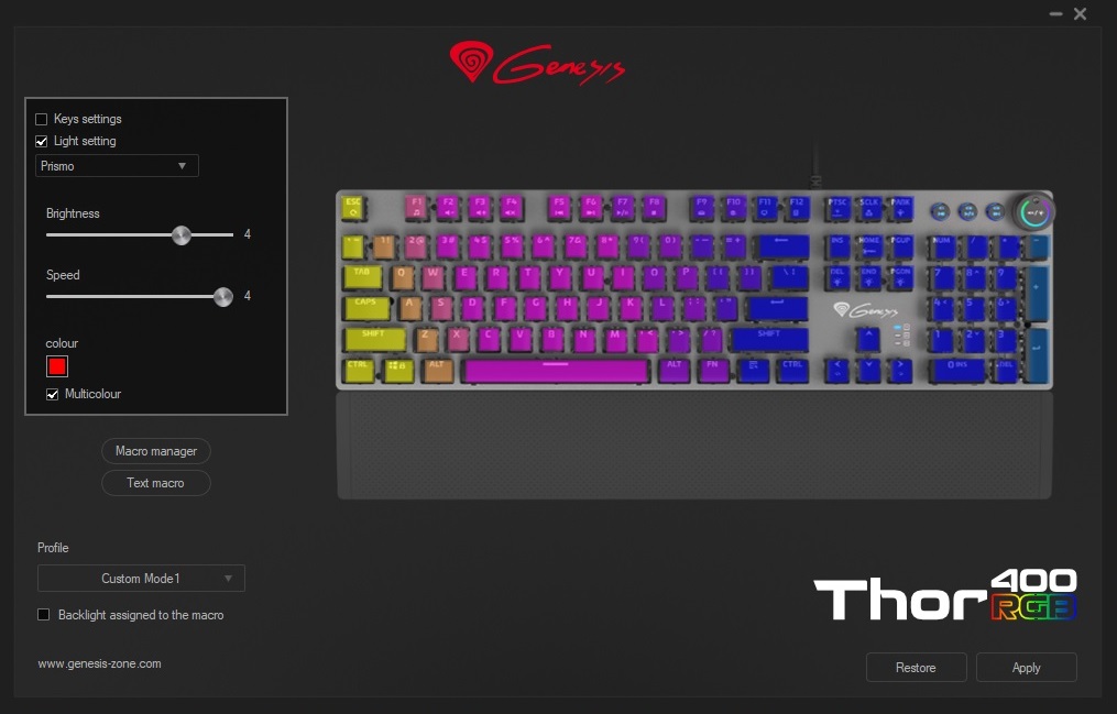 Una vez conectado, e identificado, el siguiente paso es descargar e instalar el software dedicado que ofrece Genesis a través de su web oficial. No tardamos más de unos segundos, y nada más lanzar el programa nos encontramos con una interfaz muy sencilla y discreta, pero intuitiva y con todas las opciones que necesitaremos para personalizar la iluminación LED RGB, y para crear diferentes macros y perfiles de usuario. Podremos llevar con nosotros esos perfiles, gracias a su memoria integrada.