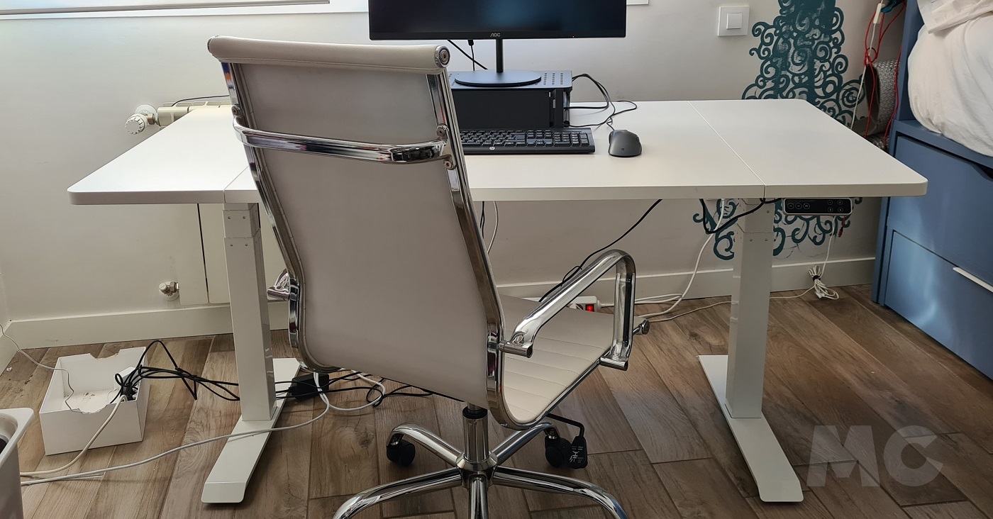 En todo caso tener ese control sobre la altura de la mesa es muy interesante también trabajando sentados. Poder ajustar con precisión la altura nos ayuda a colocar los brazos en posición correcta y escribir más cómodamente colocando así la espalda en una posición más natural. También para poder tener la pantalla a la altura ideal, incluso si tenemos más de una pantalla sobre la mesa cambiar la altura del escritorio según estemos usando una u otra.
