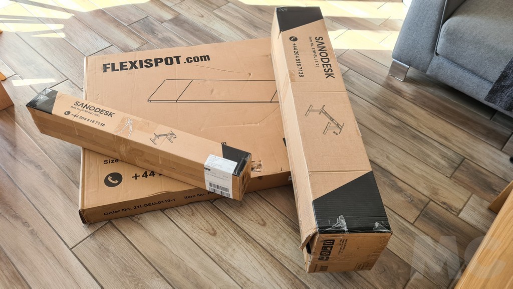Lo primero que hay que señalar es que si adquirimos un tablero la mesa llegará en tres paquetes distintos: dos para los elementos del soporte de la mesa y otro independiente en el que se envía el tablero que hayamos elegido. Es posible adquirir solamente la estructura del escritorio y adquirir el tablero por nuestra cuenta, al que al final del proceso de montaje (no es recomendable hacerlo antes) haremos los agujeros correspondientes para fijarlo al soporte.