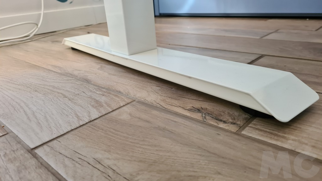 Finalmente hay que conectar y colocar el panel de mandos de la mesa sujetándolo al tablero con dos tornillos. Una vez conectados los cables ya la podremos voltear. Volvemos a advertir que el peso del escritorio es basante elevado y es necesario un mínimo de dos personas para realizar este tipo de operaciones. Para terminar la instalación podemos regular la mesa si ésta no queda perfectamente asentada modificando la altura de los pies regulables de material plástico que se encuentran en ambos soportes. Enseguida nos daremos cuenta que gracias al material, el peso y el diseño de la estructura de la mesa esta es sumamente estable.