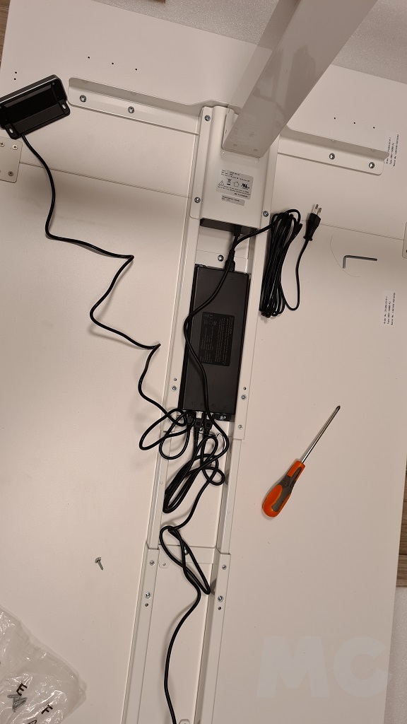 Como en el montaje de cualquier mueble de madera y como cualquier veterano en batallas con muebles del Ikea, hay que tener mucho cuidado al apretar tornillos que se introducen en tableros de matera para que no lleguemos a perforar el lacado del lado contrario. Con un poco de maña y precaución tendremos terminada la mesa y procederemos a instalar los elementos eléctricos y un protector metálico que va colocado en la parte inferior para ocultar los cables. Podemos utilizarlo también para ocultar otros cables que vayamos a tener por la mesa.