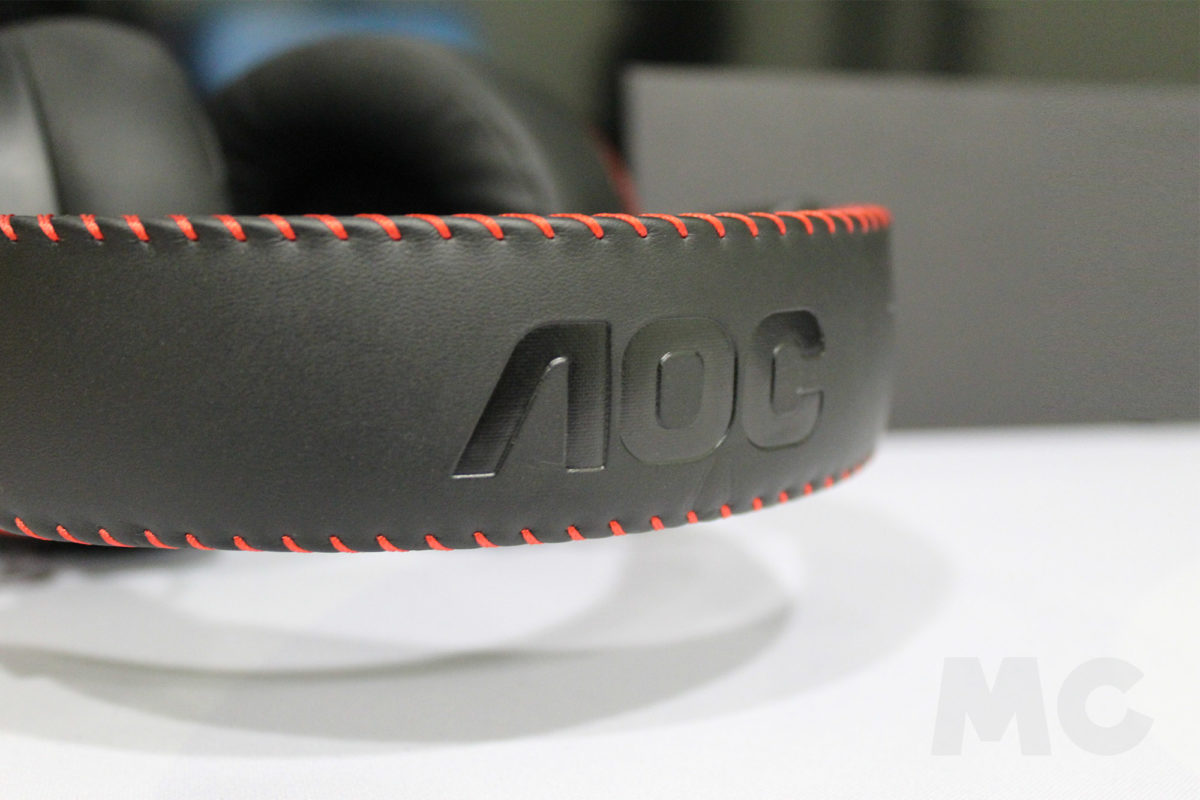Rodeando a la diadema, en la parte interior nos encontramos con una banda de espuma viscoelástica recubierta de cuero sintético, que nos ayudará a reposar y asentar los auriculares de forma cómoda sobre la cabeza. En la parte exterior contamos con una tira de cuero más endurecido, y adornado con el logotipo de AOC en un relieve inverso un remate que une ambas partes de cuero mediante una costura de hilo de nailon rojo.